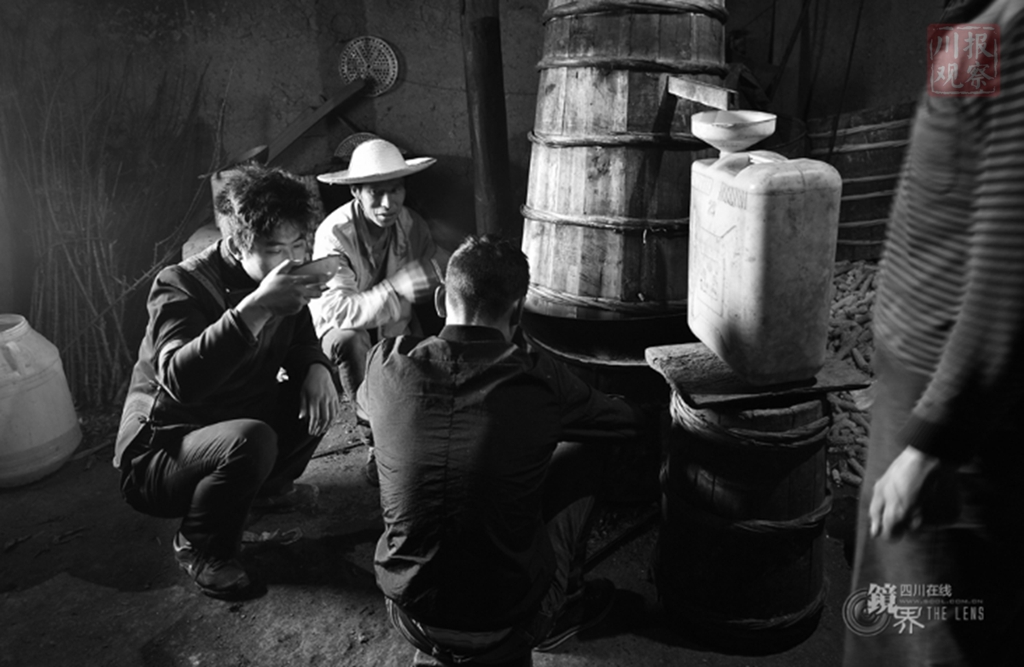 3、2017年3月15日,某色拉比在悬崖村山脚下打出了悬崖村的第一个品牌——“悬崖村某色家包谷酒”。图为某色拉比在山上的老屋里品尝刚出的包谷酒。
