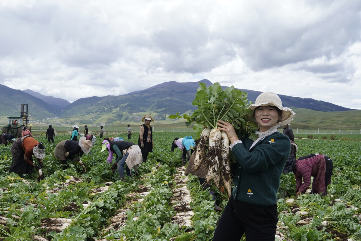 不仅如此,她还在本地开发了自己的萝卜基地,让原本只能种植青稞的土地,实现了最大化利用,也给了这些同胞提供了放牧之外的工作机会,带动川西高原高山萝卜种植规模从最初的几百亩发展到现在一万多亩。