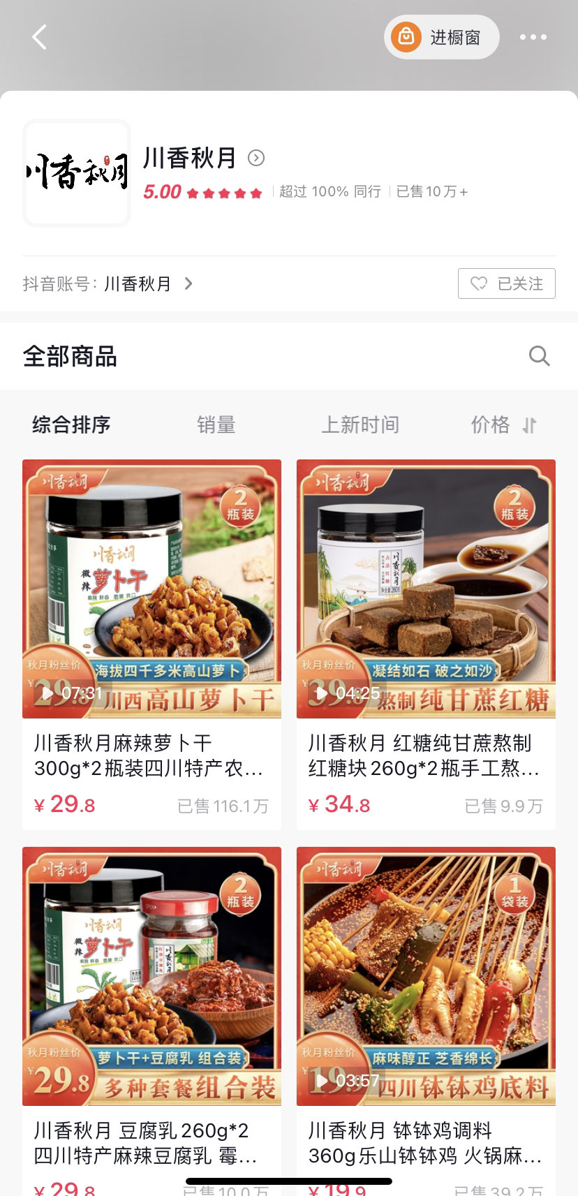 直到磨豆花的视频发出,一石激起千层浪。这一条视频,让川香秋月涨粉超过50万。她真正意识到,自己的坚持有了收获。如今,她已收获了上千万粉丝关注,还开始卖四川腐乳、辣酱、钵钵鸡调料等,随着在抖音电商越做越好,川香秋月招了很多附近村镇的村民,帮他们就业。