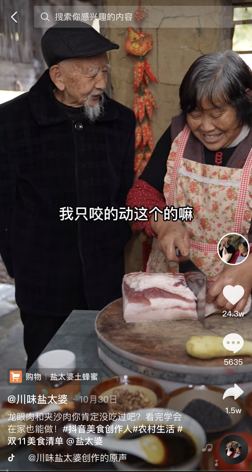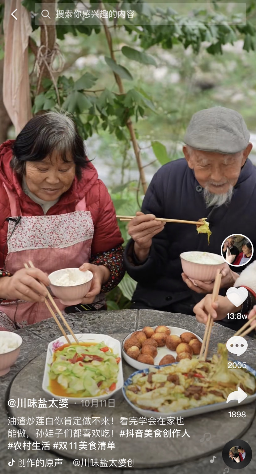 抖音号“川味盐太婆”的视频里,漆爷爷有些撒娇喊着“老太婆”三个字一出场,就意味着一顿美食将展现在大家面前。来自四川广元80多岁的漆爷爷和他的老伴阎婆婆,因制作美食视频被上千万粉丝关注。一对农村老人,能在网络备受关注,这样的“老来红”在以前是很难想象的。