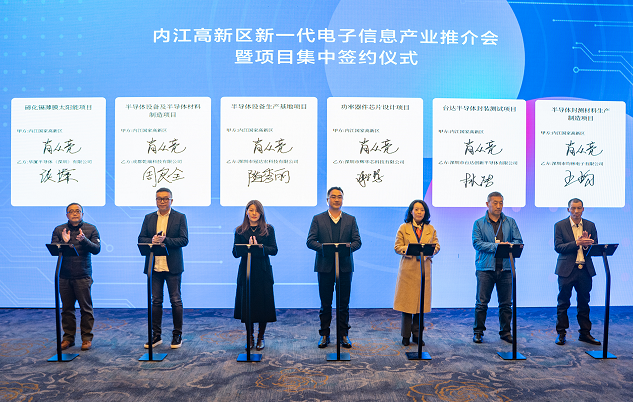 此次投资推荐会上,内江高新区与华厦半导体(深圳)有限公司、成都乾瑞科技有限公司等企业签下新一代电子信息产业项目6个,涉及碲化镉薄膜太阳能项目、半导体生产及材料制造、功率器件芯片设计等多个领域,一众项目的签约将助力内江高新区电子信息产业进一步发展。