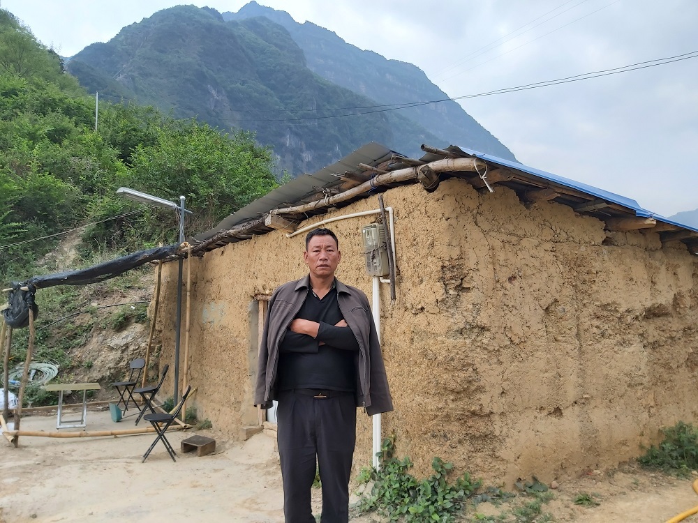 某色拉则站在垭口大儿子的土坯房前,搬往县城新家,大儿子一家是某色拉则心头最大的牵挂。袁敏 摄