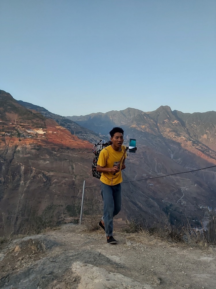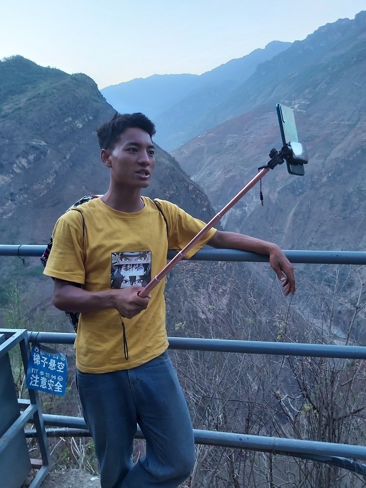 某色拉则的小儿子某色杰日在“悬崖村”钢梯上直播。袁敏 摄