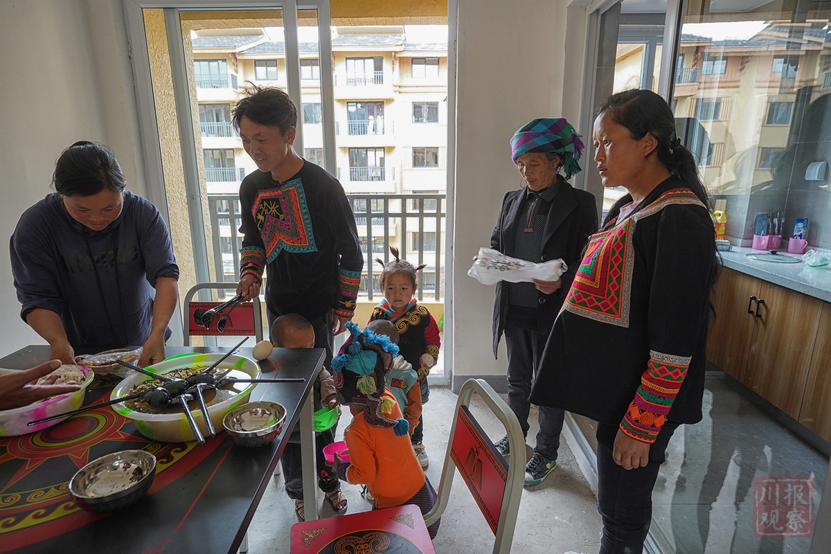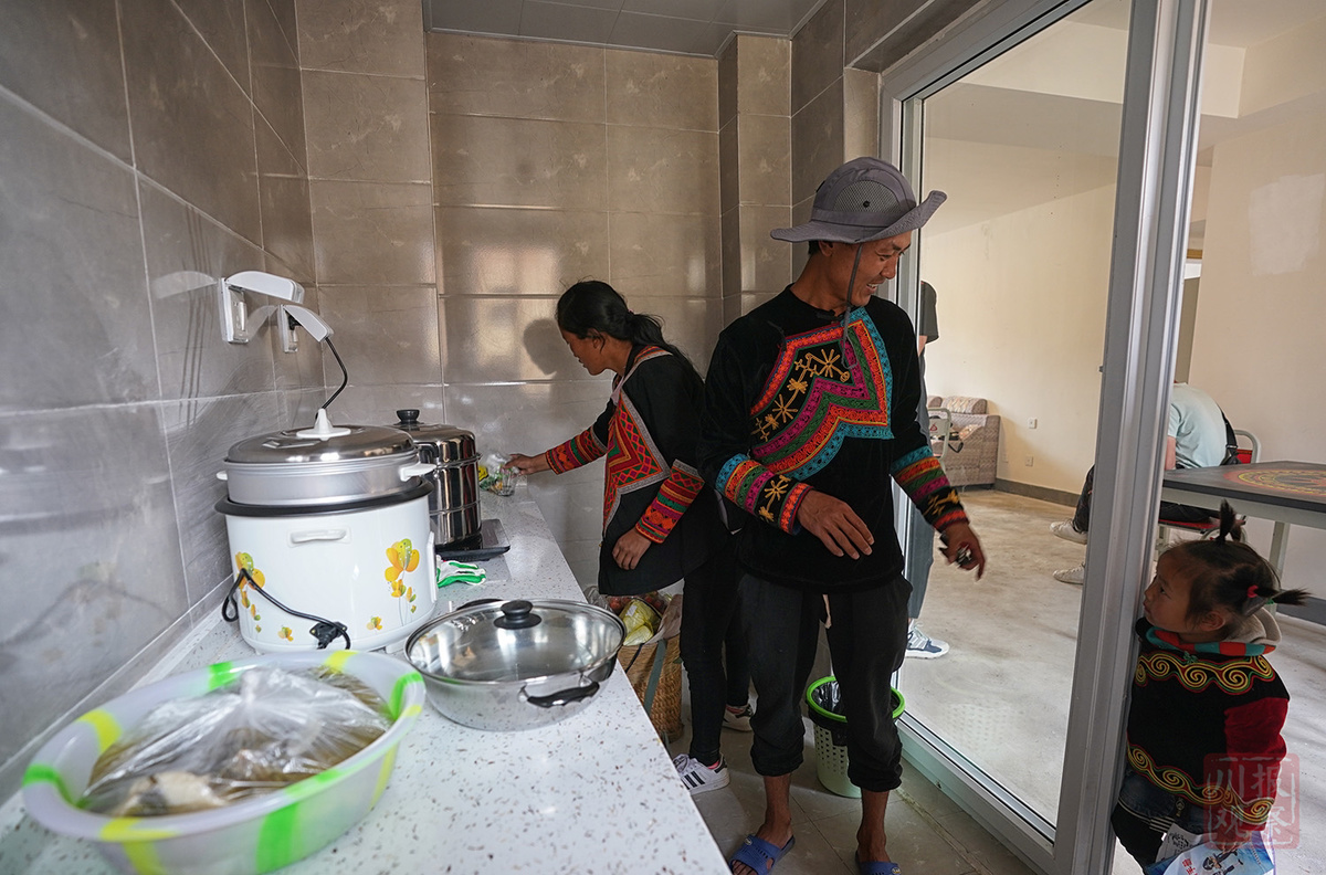 5月13日,昭觉县易地扶贫搬迁县城集中安置点迎来“悬崖村”的第二批次搬迁村民。下午17点20分,在县城集中安置点3号点拉博家100平方米新房中,乔迁新居后的第一顿开伙饭温暖开启。