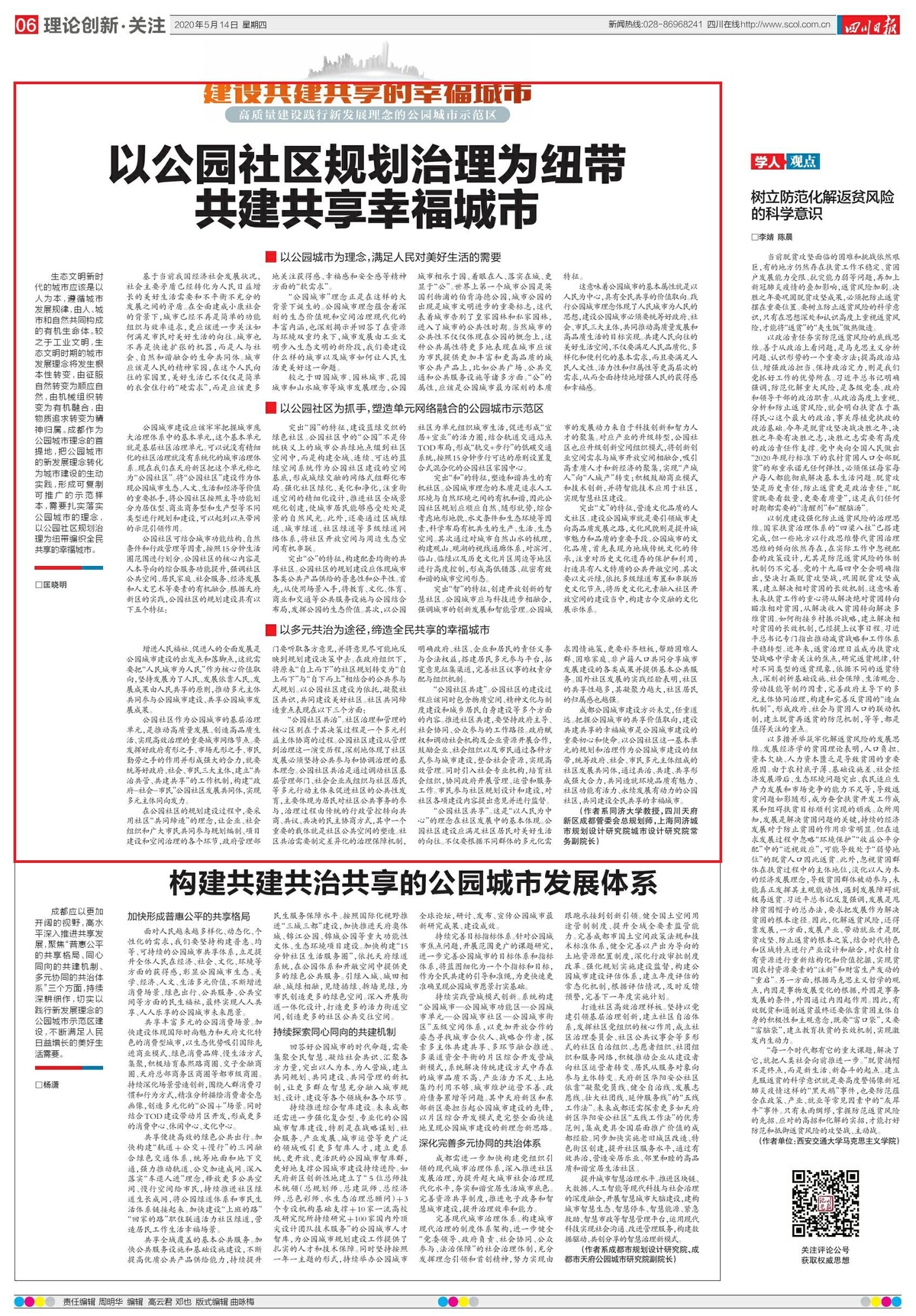 成都公园城市建设方兴未艾,任重道远。把握公园城市的共享价值取向,建设共建共享的幸福城市是公园城市建设的重要初心和使命。以公园社区这一基本单元的规划和治理作为公园城市建设的纽带,统筹政府、社会、市民多元主体组成的社区发展共同体,通过共治、共建、共享形成强大合力,共同造就环境品质有魅力、社区功能有活力、永续发展有动力的公园社区,共同建设全民共享的幸福城市。