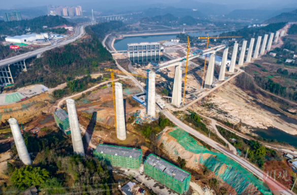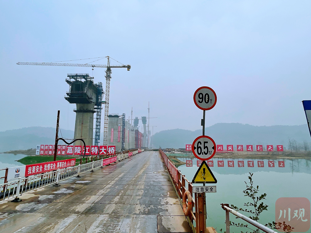 重点控制性工程、位于南部县境内的嘉陵江特大桥,是一座主跨335米的高低塔混合梁斜拉桥,为高铁同类型项目最长双线斜拉桥。大桥桥墩挺立,100余名工人奋战在一线,进行连续梁施工和主跨的索塔施工。