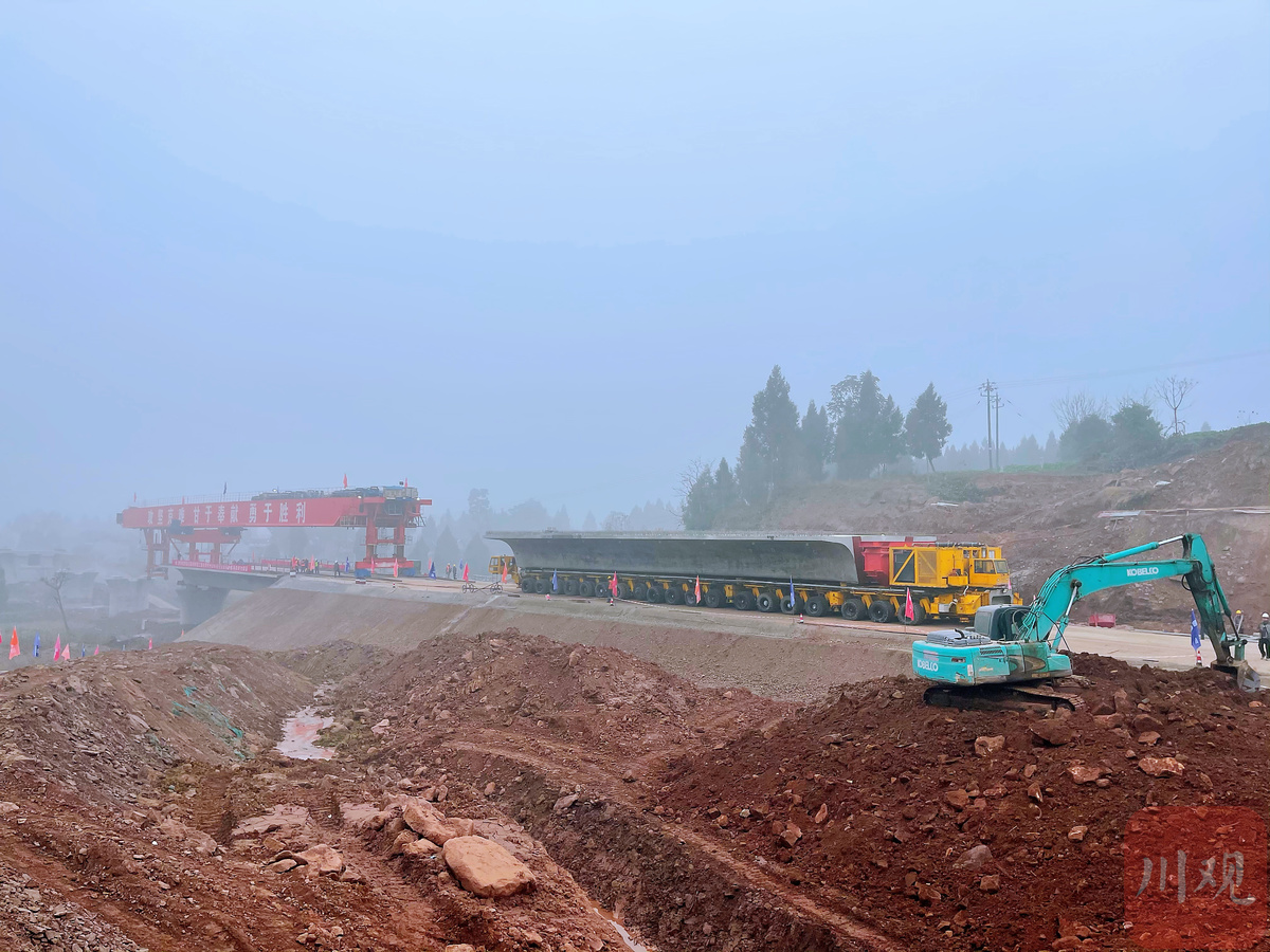 运梁车上是蓬安制梁场架设的第2榀梁,第1榀梁已于1月1日、新年第一天成功架设。“架梁是整条线路的控制性工程。”蓬安制梁场工程技术处处长黄冠达说,为确保建设进度,制梁场在去年建设之时就同步开展取证准备工作;2021年12月30日,蓬安制梁场取得工业产品生产许可证后,随即组织施工,仅隔2天时间就成功架设首榀梁。