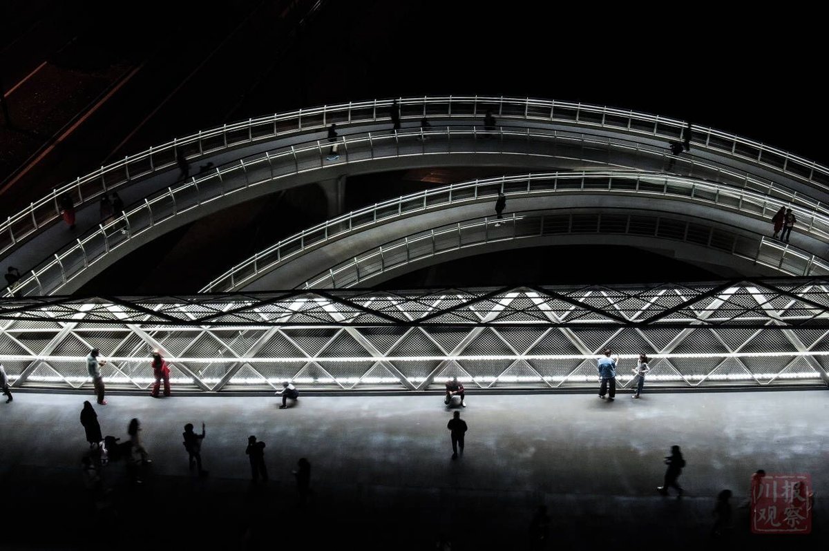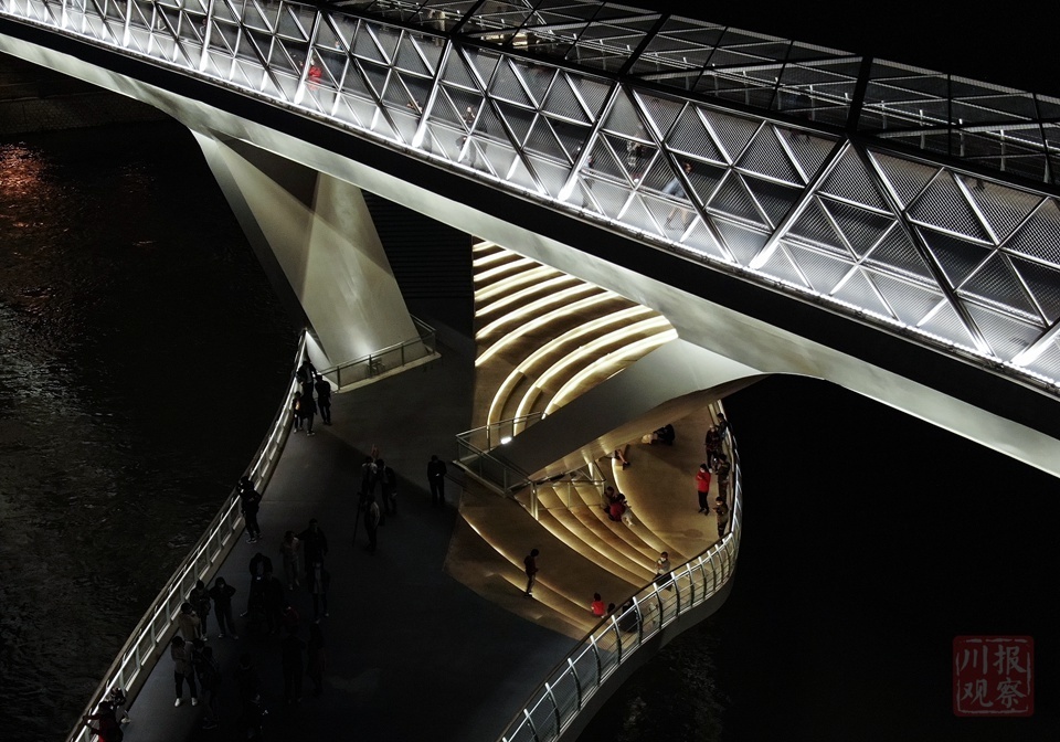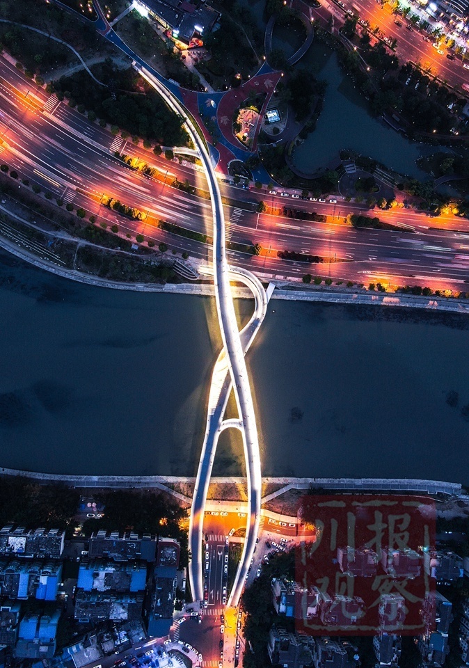 这座桥由四川省建筑设计研究院耗时几年才完成设计,灵感源于莫比乌斯环。大桥整体造型采用双层结构,主桥在上,副桥在下,从上空俯瞰,类似一个“∞”的符号,副桥向下部分还专门设置了环绕式剧院台阶步道,供游人驻足和休息。