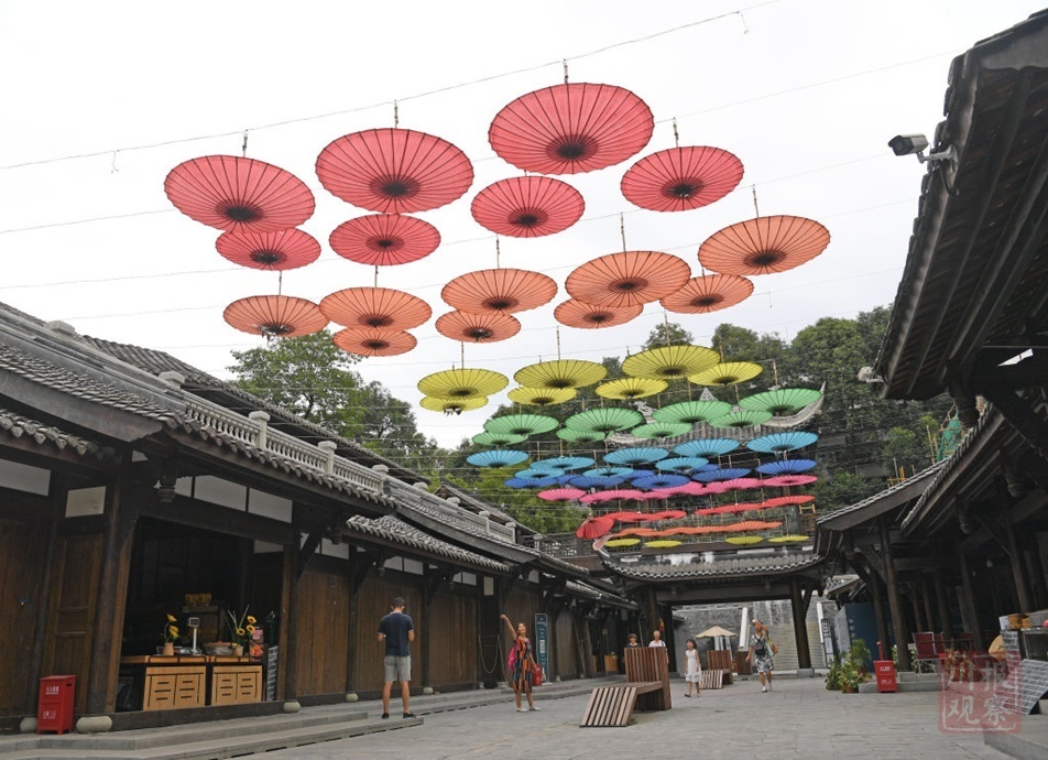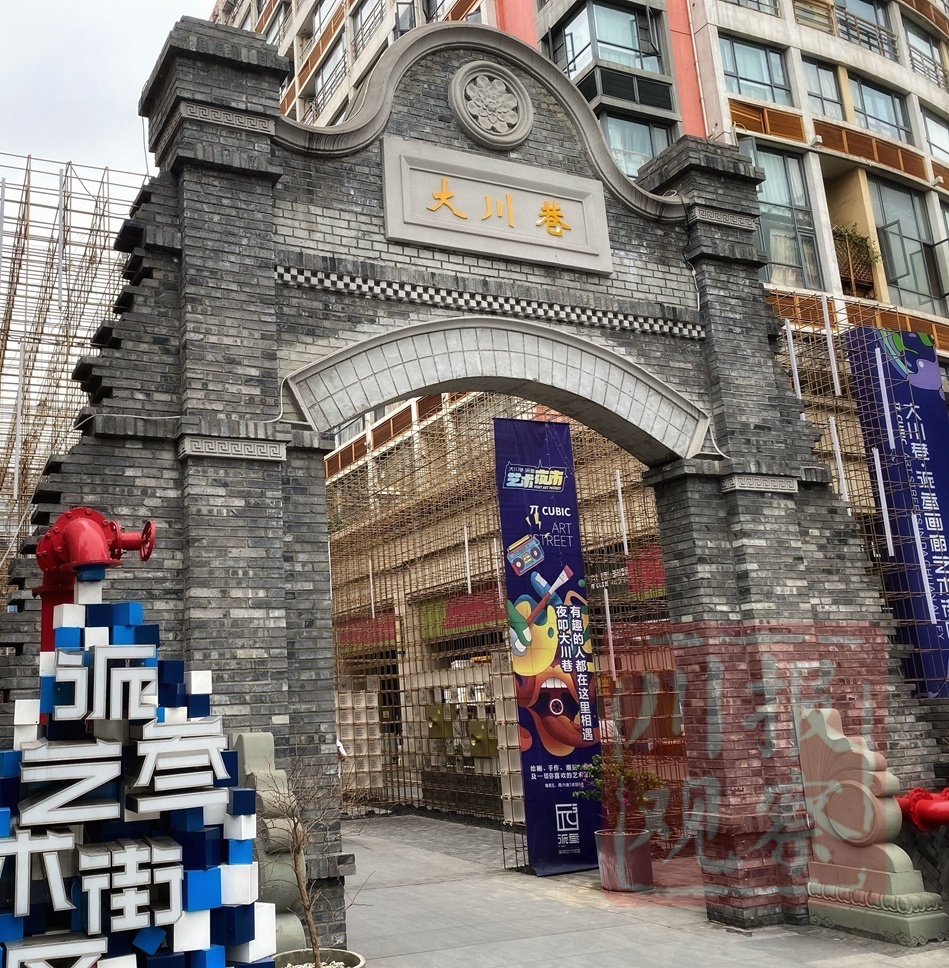 位于合江亭附近的大川巷,过去是“快递一条街”。通过政府引导,企业主体,市场化运营方式,去年夏天被改造成以绘画为主的城市艺术街区,复原了一部分老成都居民建筑,也新建了古风门廊和一些户外艺术装置。