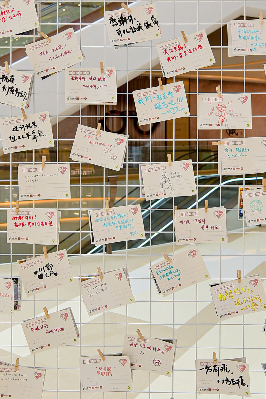 同时展出的,还有治愈、清新的手绘风战疫明信片,这些明信片一经出现就被大小朋友们一抢而空、爱不释手,纷纷在明信片上写下心里话,记录对武汉的祝福,对白衣天使的感恩!