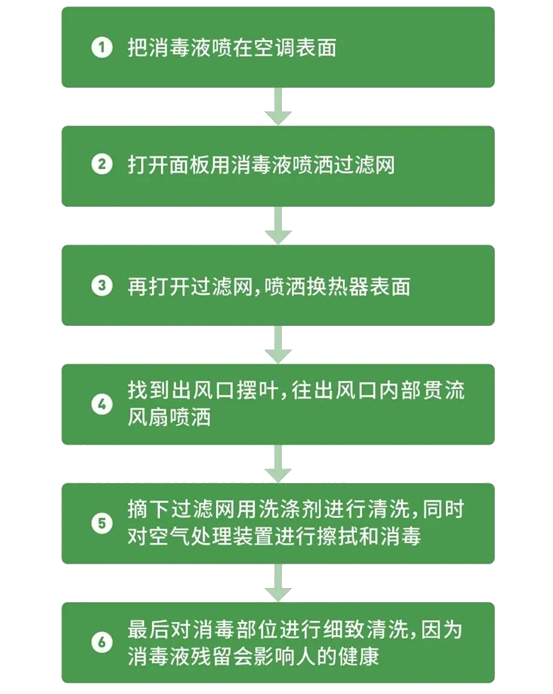 (六)空调通风系统的常规清洗消毒应当符合《公共场所集中空调通风系统清洗消毒规范》(WS/T 396-2012)的要求。可使用250mg/L~500mg/L含氯(溴)或二氧化氯消毒液,进行喷洒、浸泡或擦拭,作用10分钟~30分钟。对需要消毒的金属部件建议优先选择季铵盐类消毒剂。