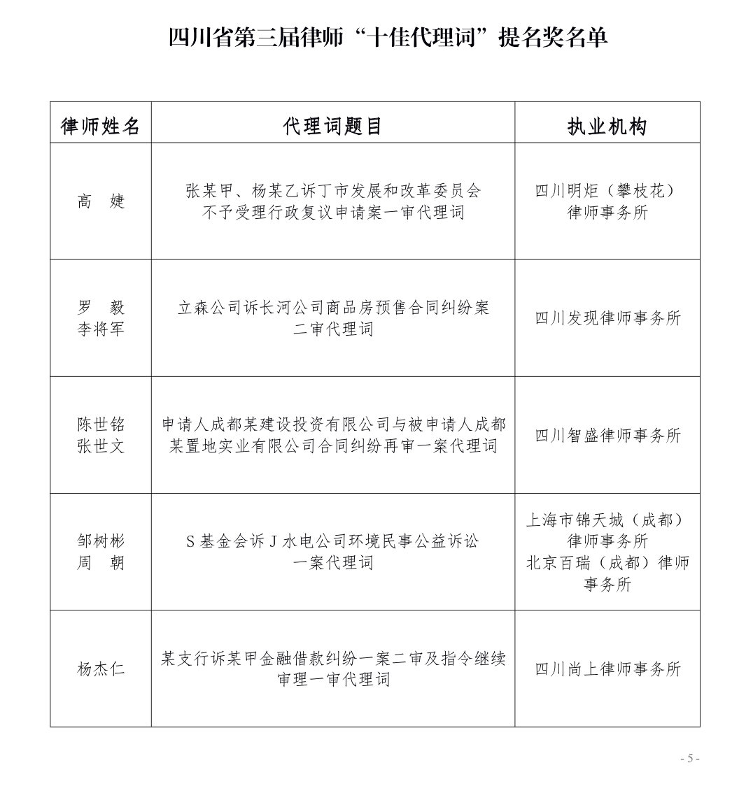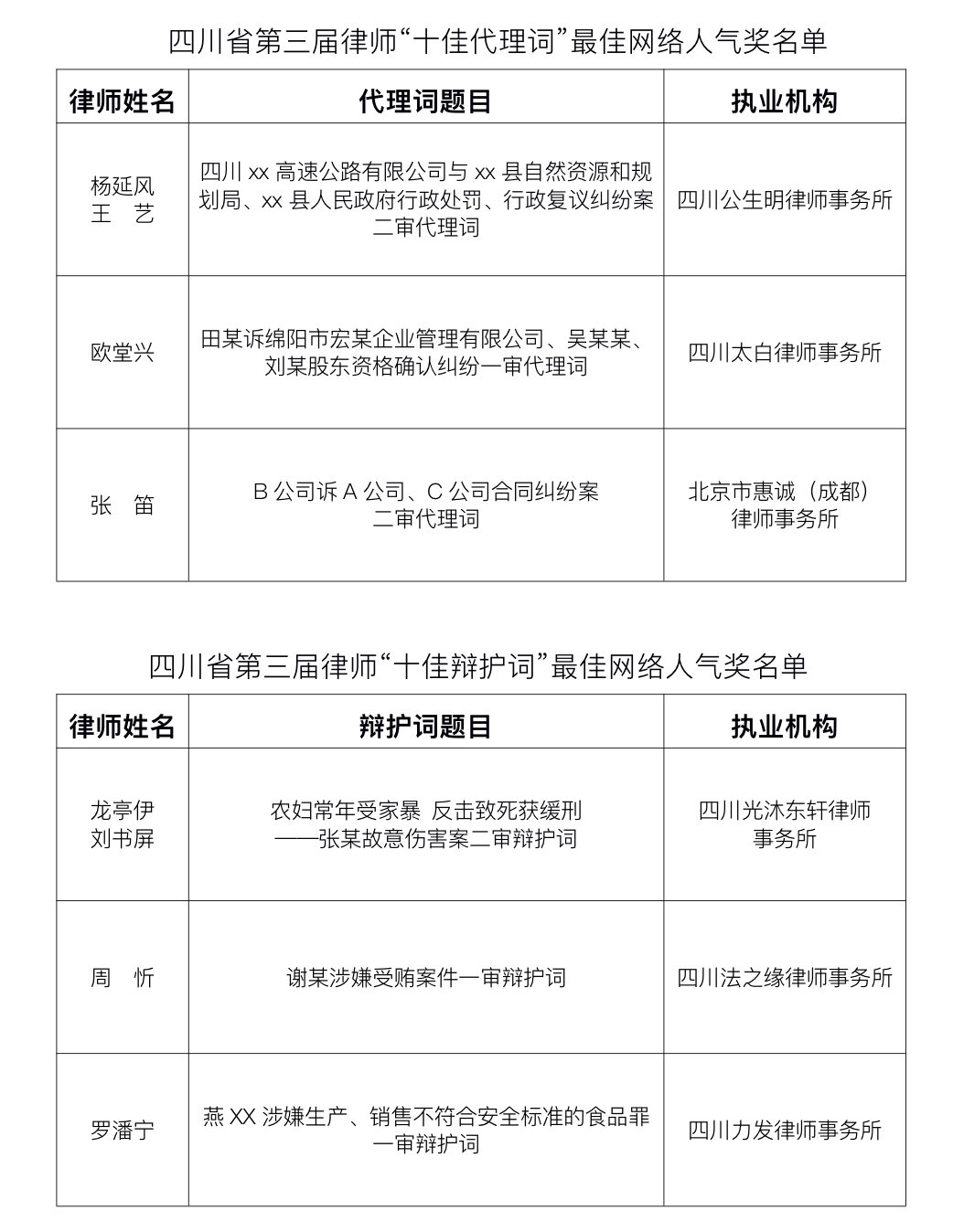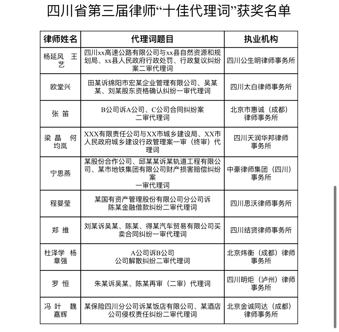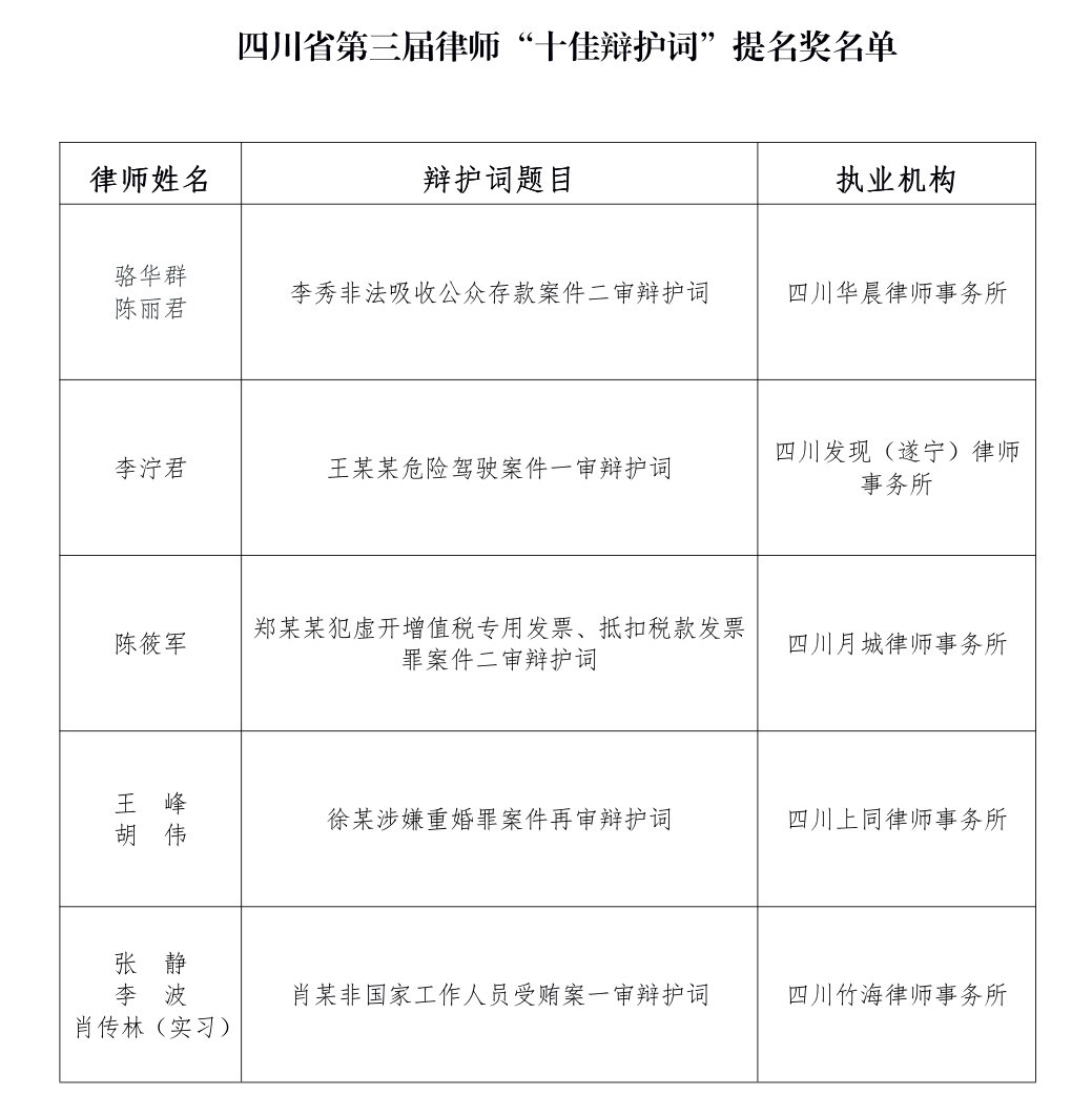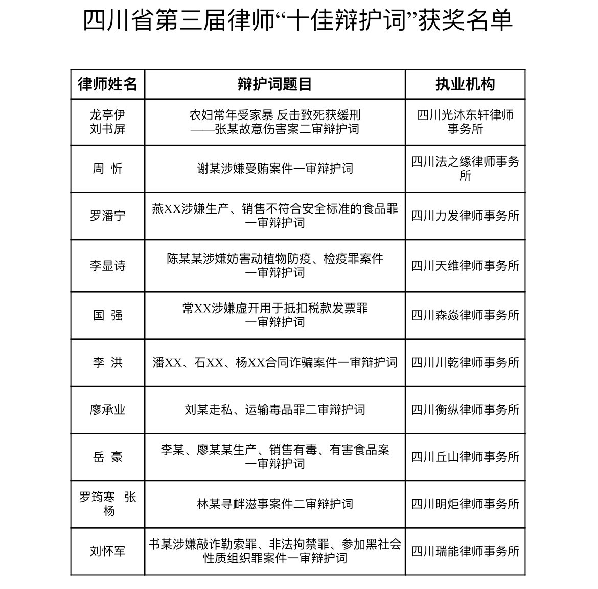 1月7日,四川省第三届律师“十佳代理词”“十佳辩护词”发布会在成都举行,现场发布了获奖名单。
