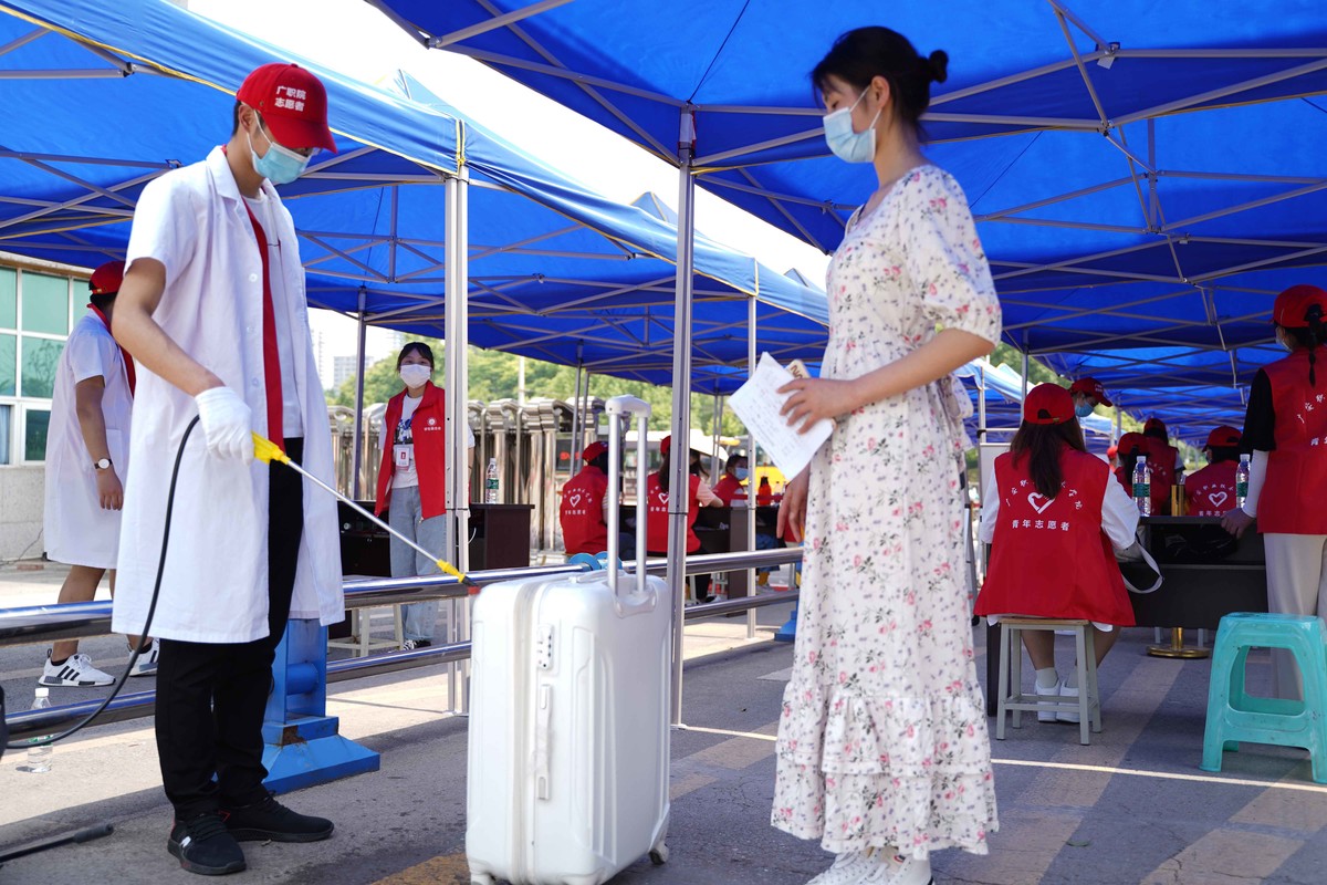 测量体温、出示健康码、学生证、行李消毒……5月16日,时隔4个多月,广安市广安职业技术学院迎来了首批学生返校,学生们都戴着口罩,按照入门口处地上的小红贴排队,有序进入学校。
