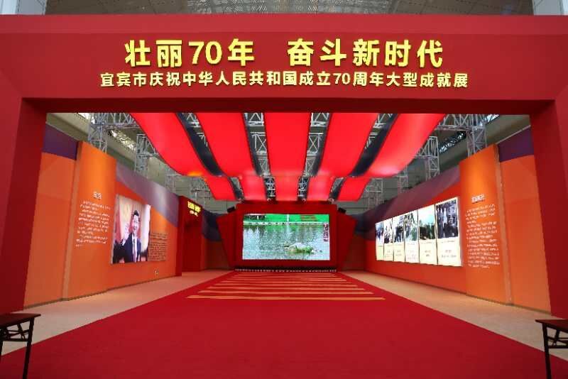 去年9月26日下午,为庆祝中华人民共和国成立70周年,展示宜宾市经济社会发展取得的成就,长江首城—四川宜宾市庆祝中华人民共和国成立70周年大型成就展正式开展。本次展览分为市展和省展两部分。市展分为序厅“长江首城宜人宜宾”、第一部分“开天辟地百业俱兴”、第二部分“改革春风宜宾新颜”、第三部分“同心筑梦美好宜宾”、第四部分“不忘初心砥砺前行”共五个部分。展览主要采用大型成果展览典型手法,用构成式图文版式、舞台化空间装置、大型数字影像投影与LED大屏等手段进行展现。在展馆外的广场上,还为观众准备了6个打卡拍照框,观众在参观展览后可以留下关于中华人民共和国成立70周年的珍贵记忆。