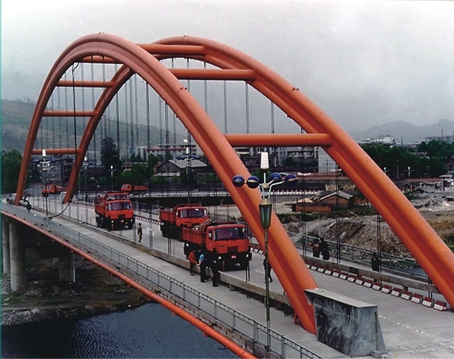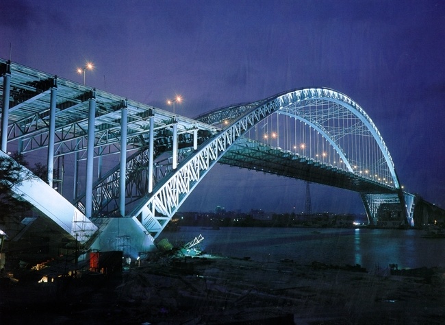 1990年建成,为115米下承式钢管混凝土系杆拱桥,国内第一座钢管混凝土拱桥。