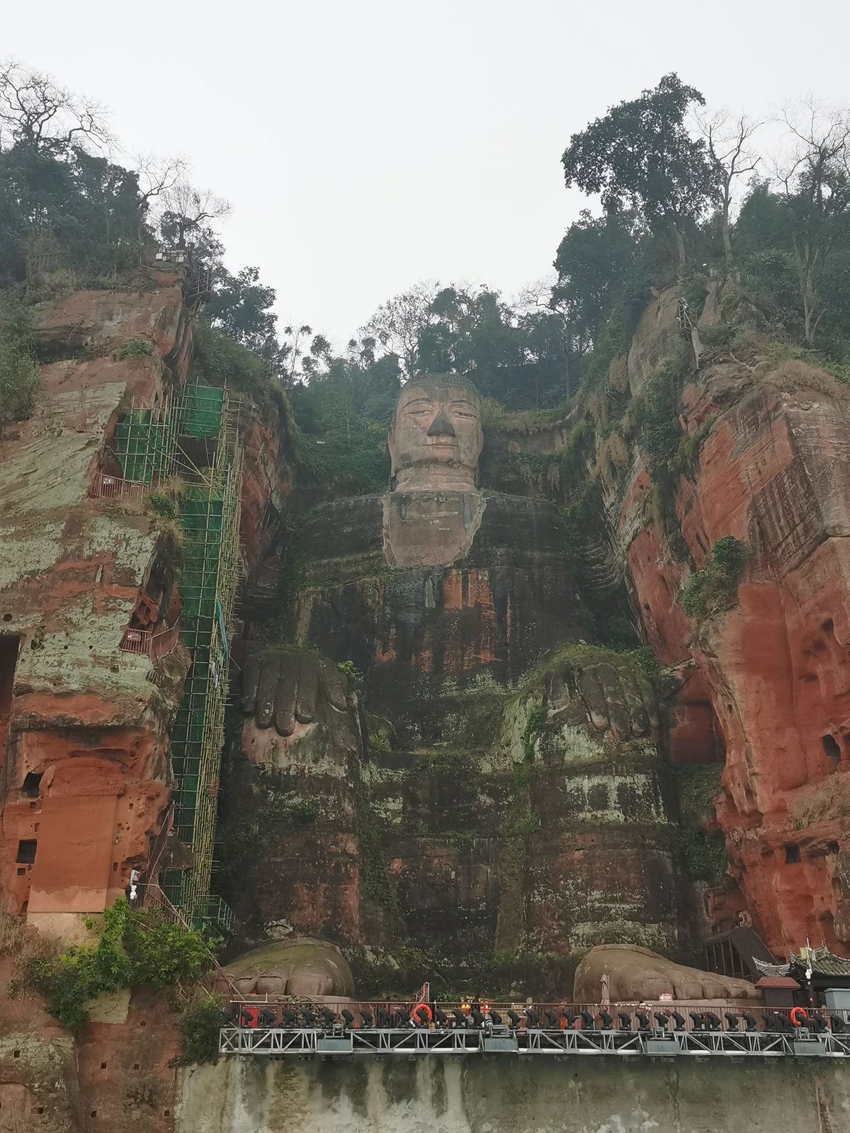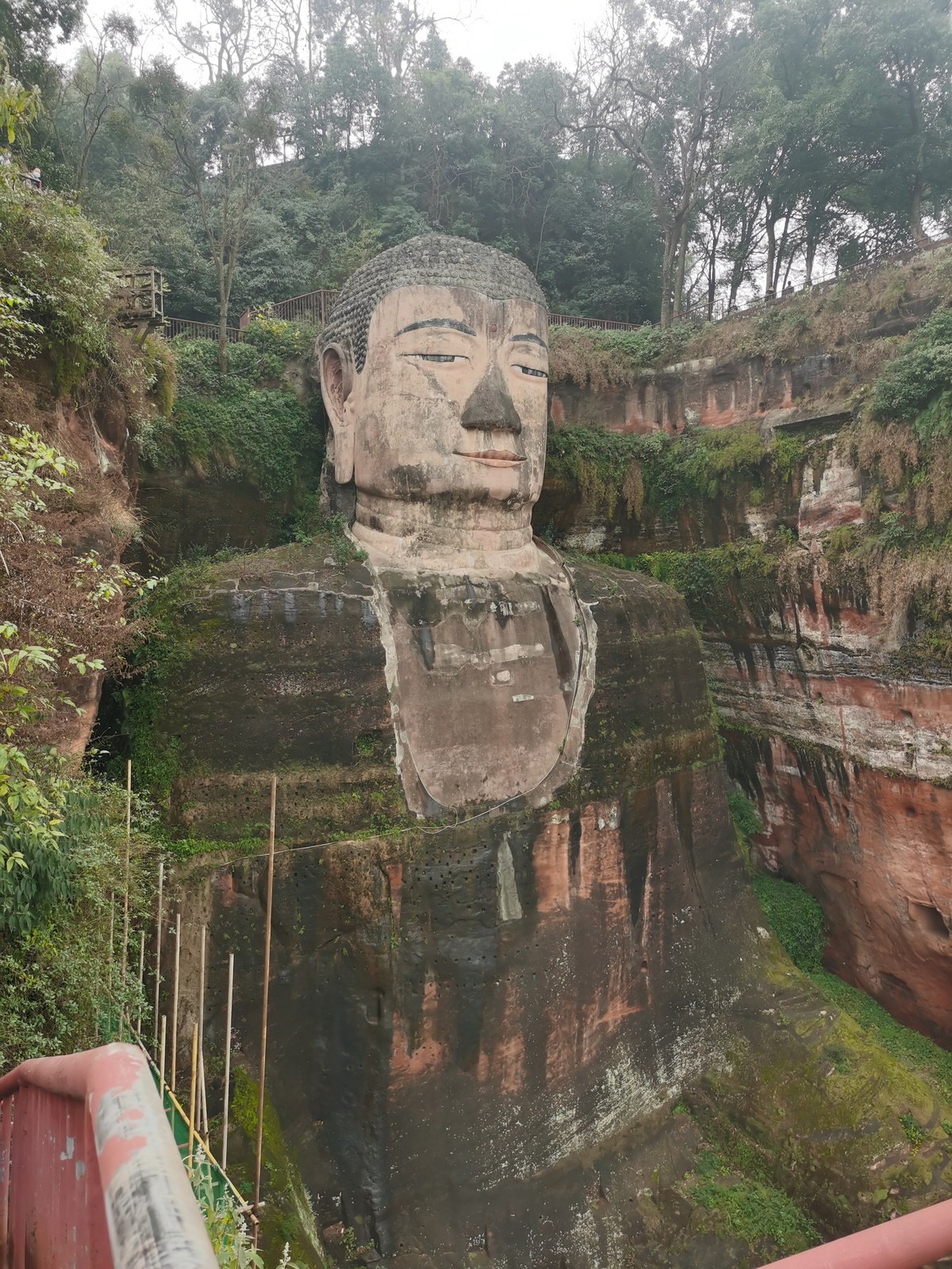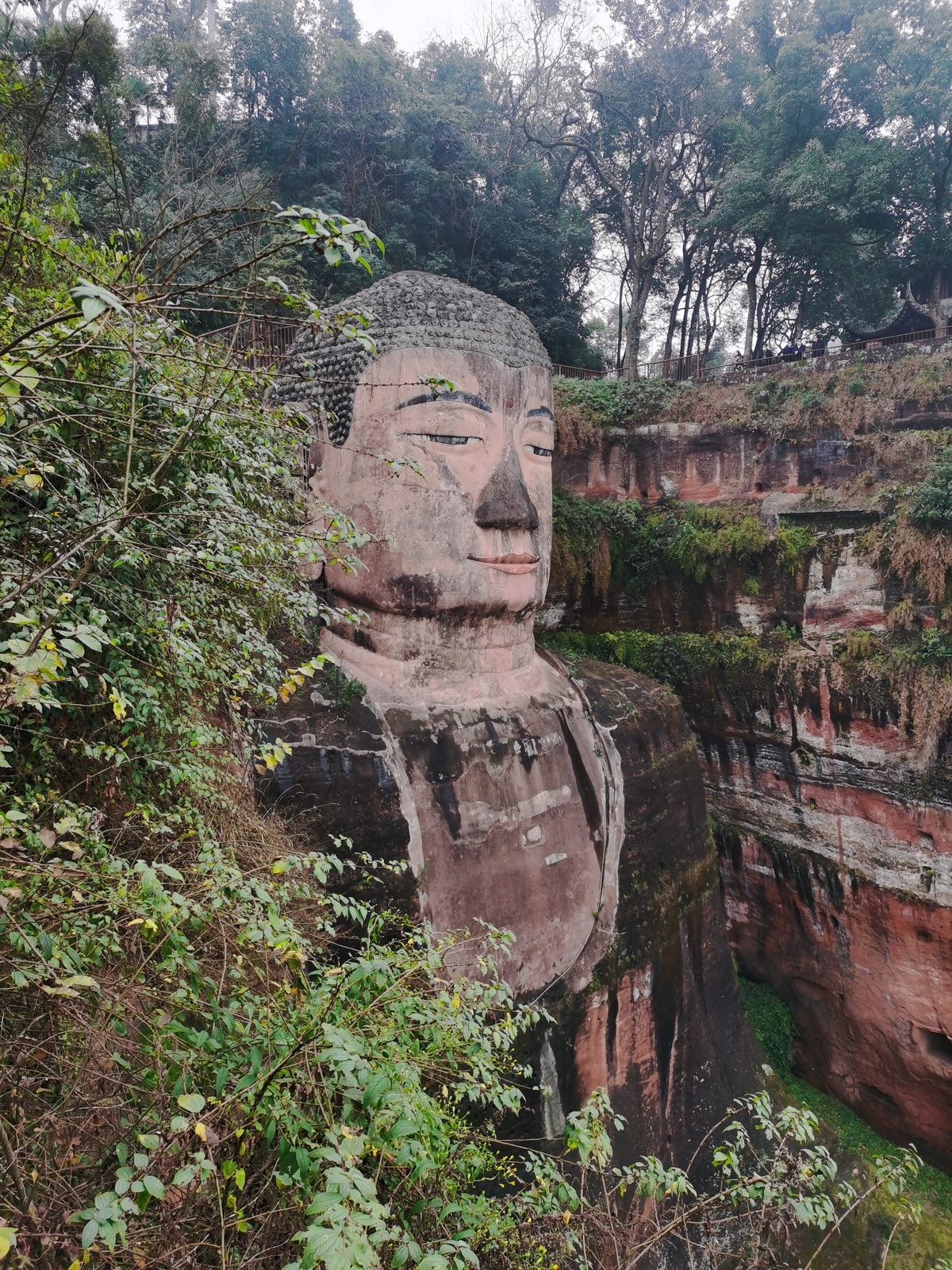 站在山顶护栏处,明显可以看到大佛和两年前有点不一样——层层发髻中生出了丛草,额头、下巴尤其鼻头长出青苔,佛头和胸口多条裂隙蔓延。如果站在大佛脚底,可以看到渗水打湿了大佛衣襟,灌木草丛在佛身生长。