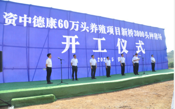 5月15日,德康集团60万头生猪产业化项目1.5万头种猪场、3000头种猪场分别在资中县铁佛镇和新桥镇举行开工仪式。