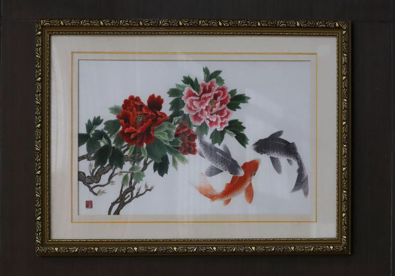 蜀绣作品《芙蓉鲤鱼图》,鲤鱼象征吉祥如意、连年有余,配景为成都市花芙蓉。作品采用蜀绣传统针法,体现鱼、花、叶、杆不同的特点,鲤鱼神情怡然、栩栩如生,花叶色泽饱满、层次分明。