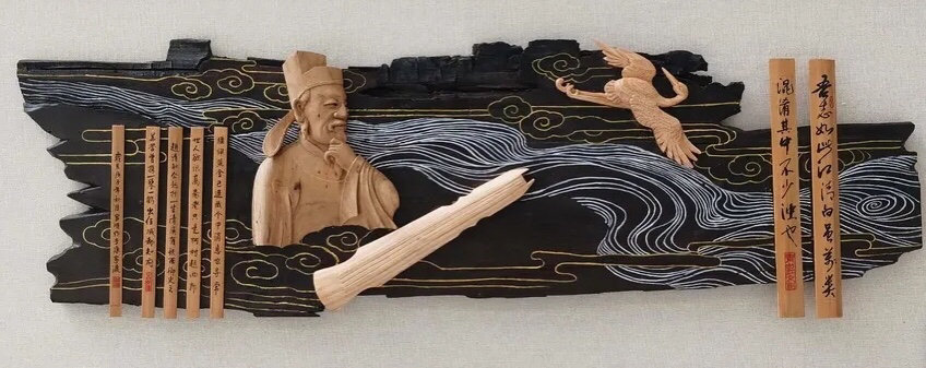 《赵抃与青白江》木雕作品以乌木作背景,用杉木刻浮雕,再以竹片刻上诗句,将大宋御史赵抃携一琴一鹤入川,在湔江上立下“吾志如此江清白,虽万类混淆其中,不少浊也。”誓言的故事,生动形象地呈现出来。