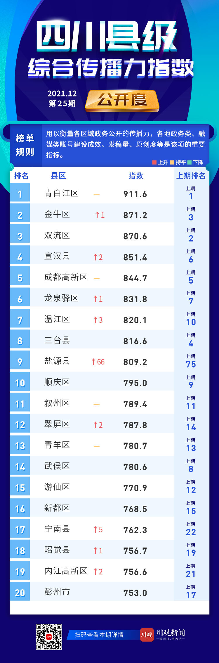 1月14日,四川县级综合传播力指数第25期(2021年12月)发布。本期指数的数据采集时间段是2021年12月1日至12月31日,共涉及3.3万余个有效活跃账号,82.8万余篇文章(视频,网页)。