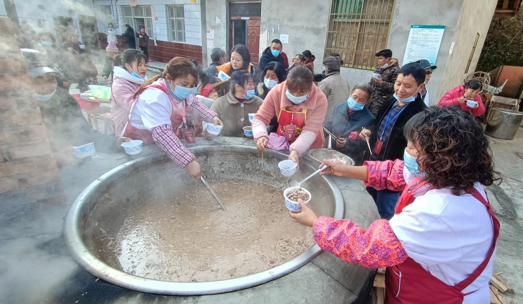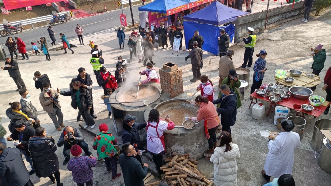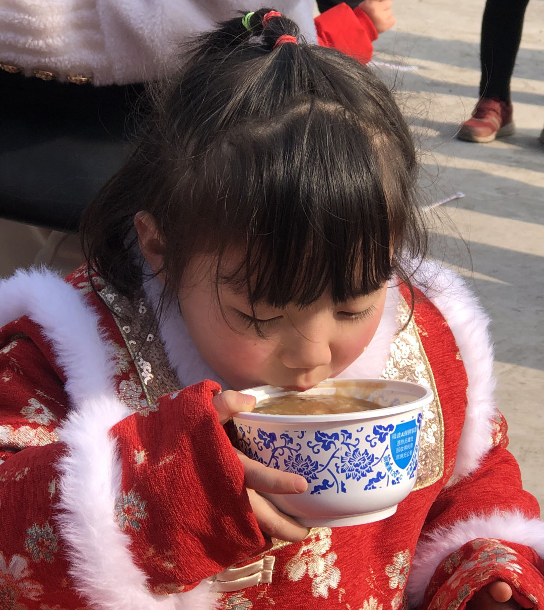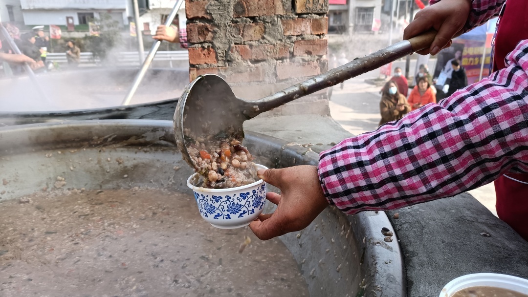 上午11时许,伴着一声“出锅咯!”,众人有序地围过来,热气腾腾的腊八粥香味浓郁,分发到在场者手上,稀里呼噜地喝个尽兴,浑身暖烘烘,寓意着事事“粥”到。