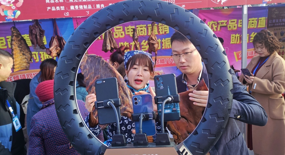 “宝宝们,我们今天给大家备了腊猪舌、猪头、精排等等,都是正宗黑土猪熏制的,日常价68元一斤,今天只要48米,非常划算,错过就没有咯!”镜头前,绿阳阳电商合伙人兼网络主播何俊娴熟地介绍着。这位曾多年在深圳等沿海地区工作的87年小伙如今回乡创业,专职做网络直播销售土特产。“借助腊八节,我们的腊肉香肠打出了名气,我们有十几个小伙伴做电商直播,线上年销售额达800余万元呢,尤其是要过年了,好多在外的家乡人都通过网络下单,最多的时候一天卖出了2000斤。”何俊说。