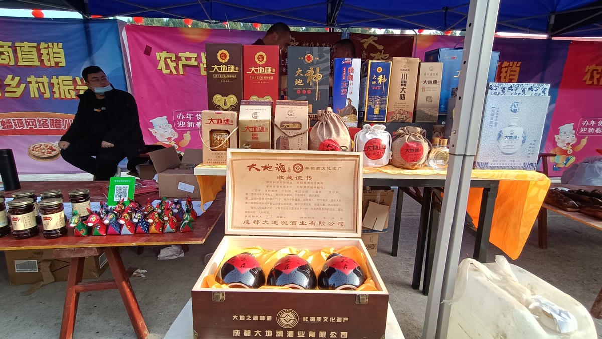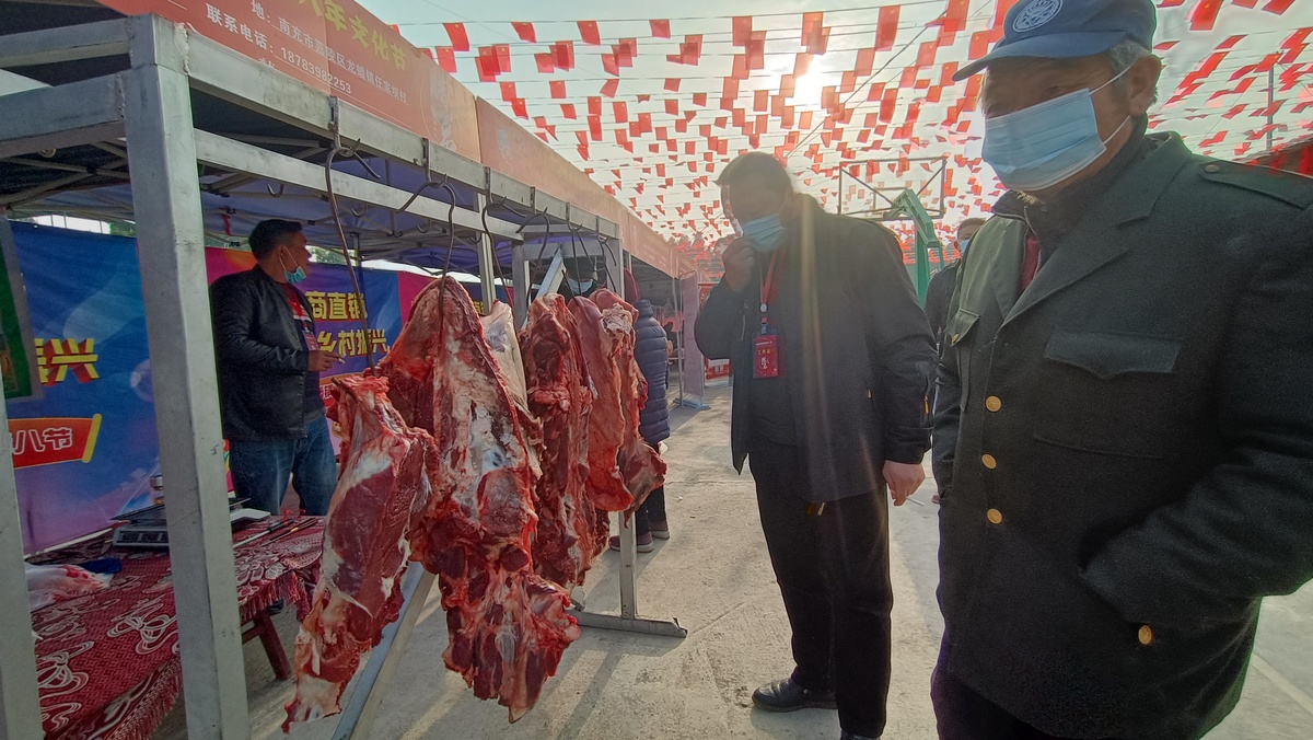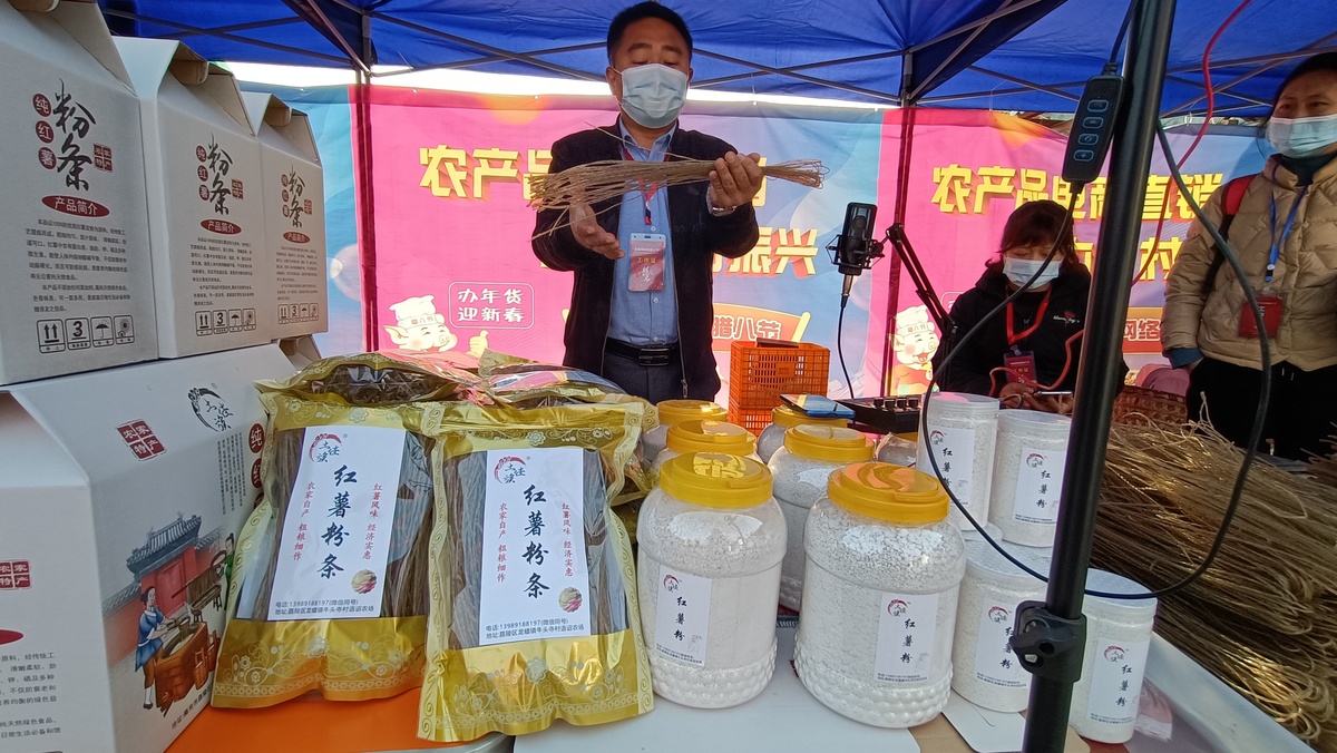 除了腊八粥,活动现场处处散发着“年味”,龙蟠镇周边的农业专合社、企业、家庭农场主们带着自产的年货现场推销。与往年不同的是,每一摊位前支起了用于直播的三脚架等装备,商家亲自上阵,化身网络主播现场吆喝起土猪肉、腊肉、香肠、粉条、米豆腐、柑橘等土特产。