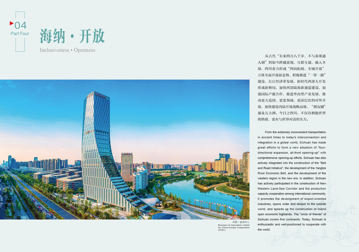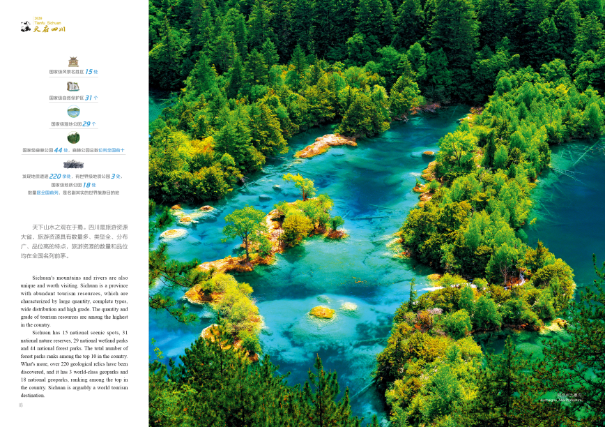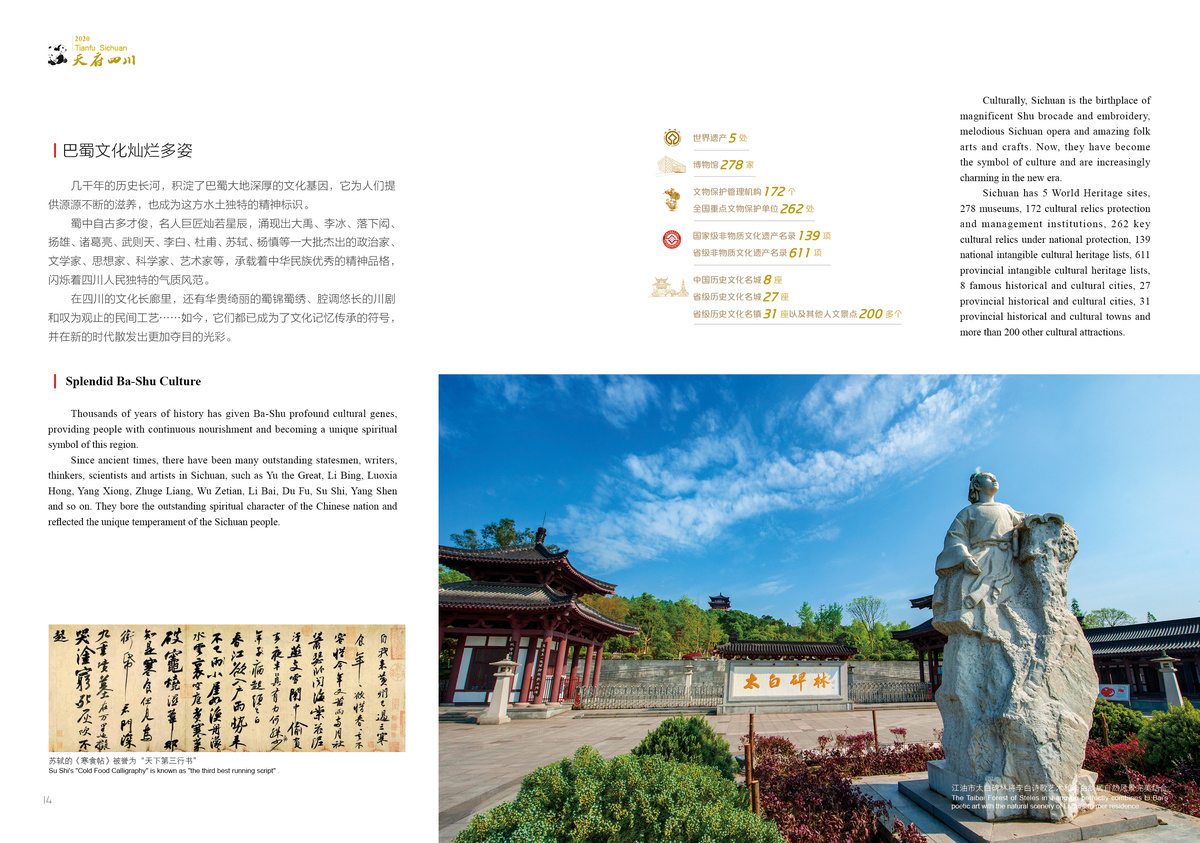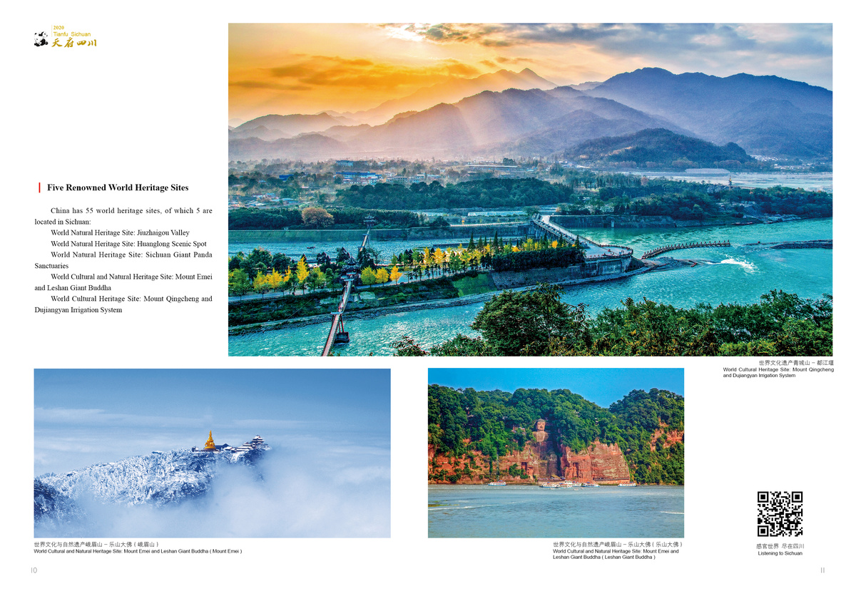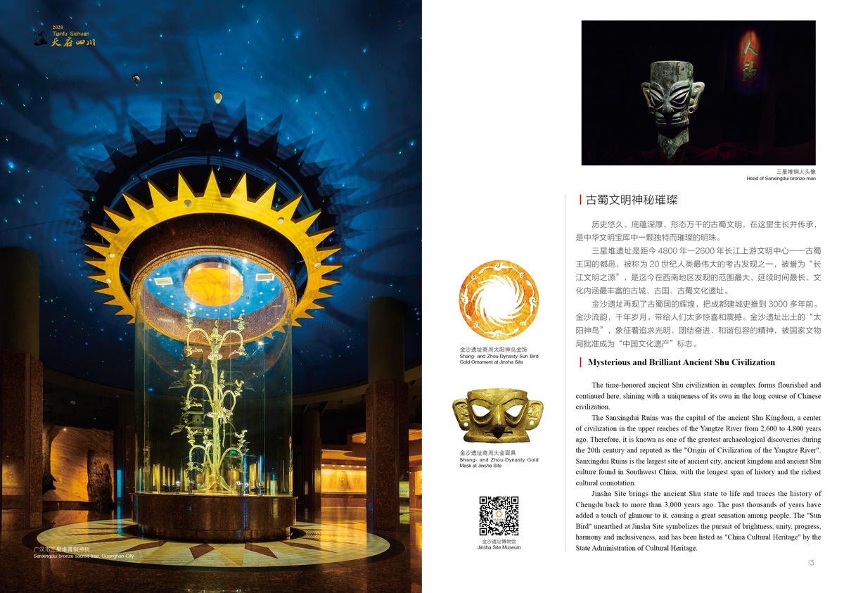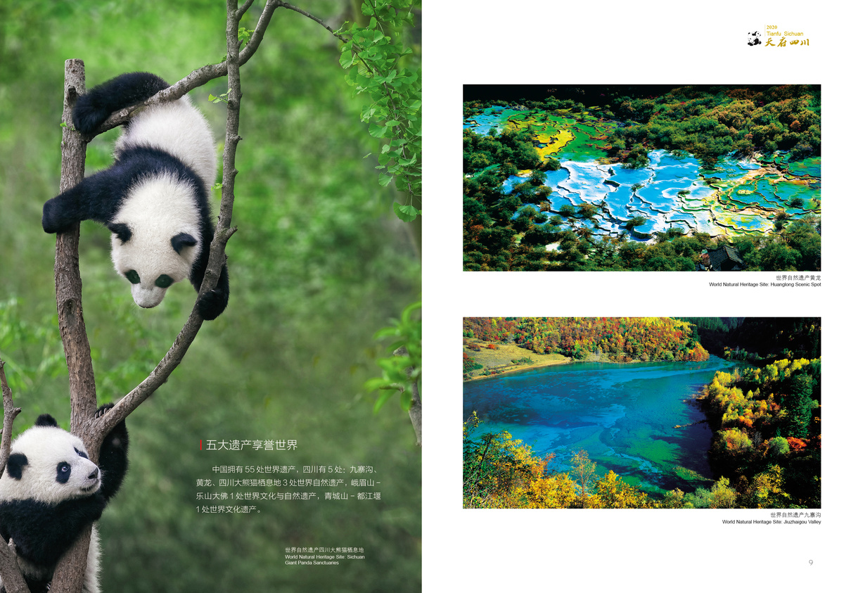 Sanxingdui is an epitome of the brilliant ancient Shu civilization; Jiuzhaigou Valley is endowed with breathtaking scenery; giant pandas dwell in a pleasant ecological environment.
