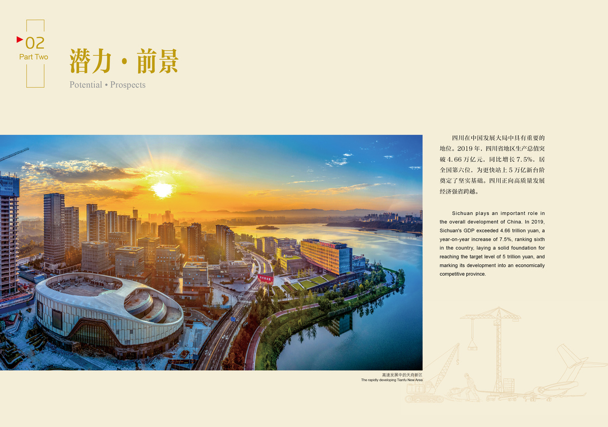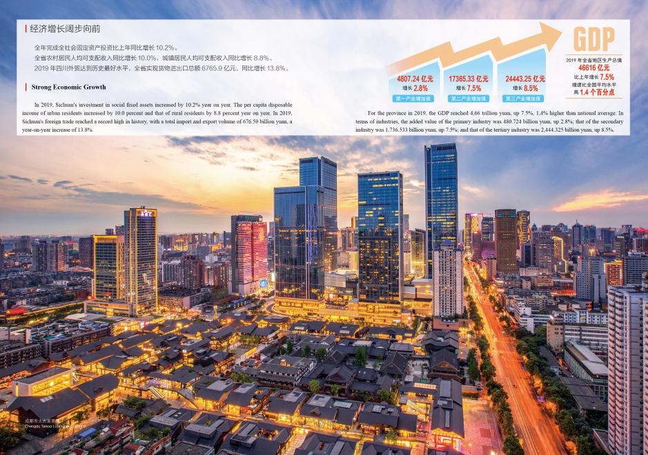 In 2019, Sichuan's GDP exceeded 4.66 trillion yuan, a year-on-year increase of 7.5%, ranking sixth in the country, laying a solid foundation for reaching the target level of 5 trillion yuan, and marking its development into an economically competitive province.