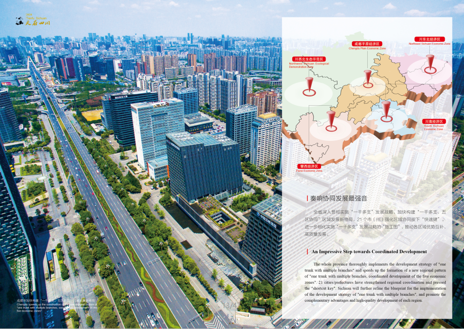 The whole province thoroughly implements the development strategy of "one trunk with multiple branches" and speeds up the formation of a new regional pattern of "one trunk with multiple branches, coordinated development of the five economic zones". 21 cities/prefectures have strengthened regional coordination and pressed the "shortcut key". Sichuan will further refine the blueprint for the implementation of the development strategy of "one trunk with multiple branches", and promote the complementary advantages and high-quality development of each region.