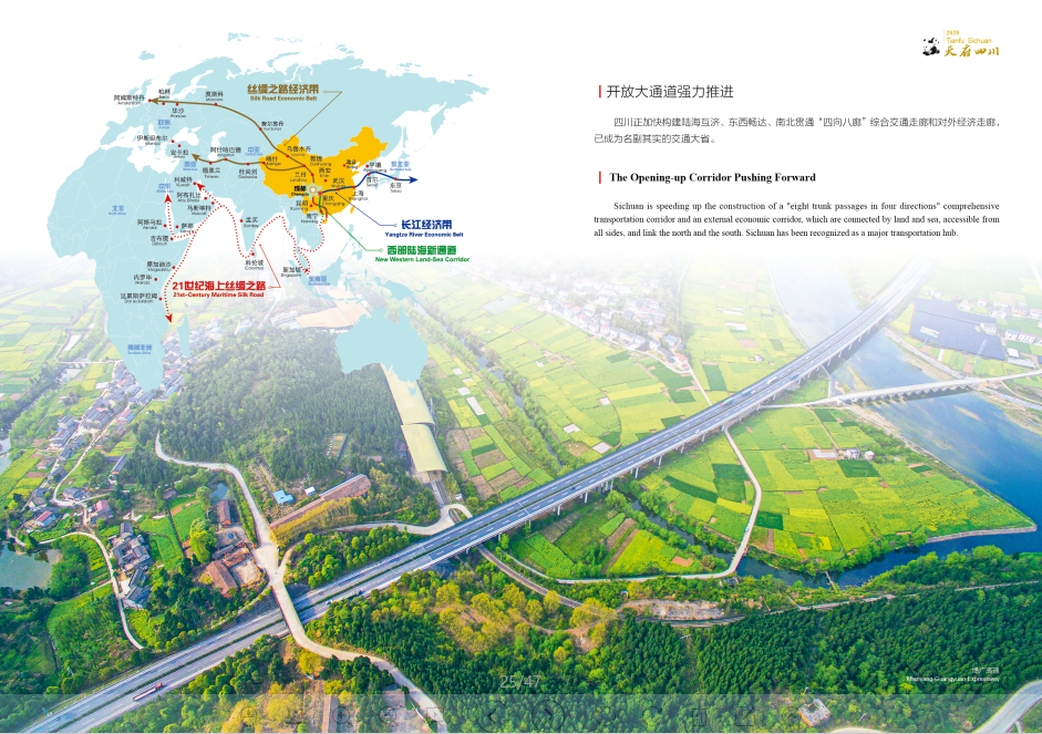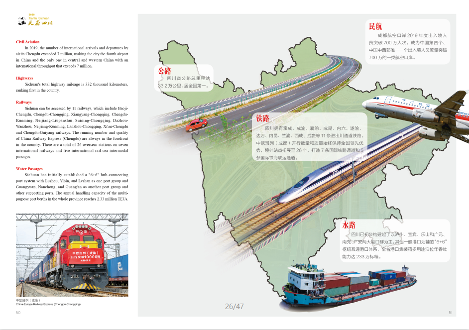 Sichuan is speeding up the construction of a "eight trunk passages in four directions" comprehensive transportation corridor and an external economic corridor, which are connected by land and sea, accessible from all sides, and link the north and the south. Sichuan has been recognized as a major transportation hub.
