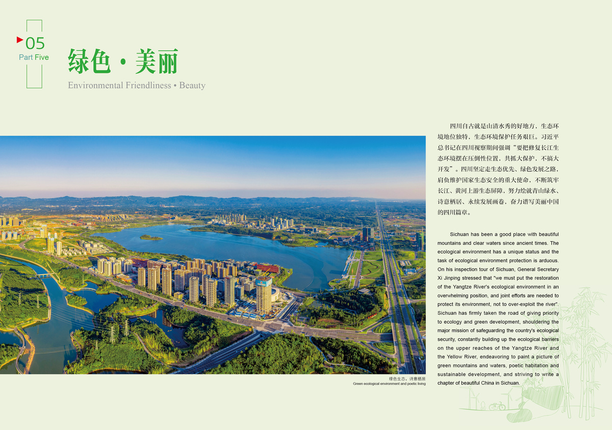 Sichuan has firmly taken the road of giving priority to ecology and green development, shouldering the major mission of safeguarding the country's ecological security, constantly building up the ecological barriers on the upper reaches of the Yangtze River and the Yellow River, endeavoring to paint a picture of green mountains and waters, poetic habitation and sustainable development, and striving to write a chapter of beautiful China in Sichuan.