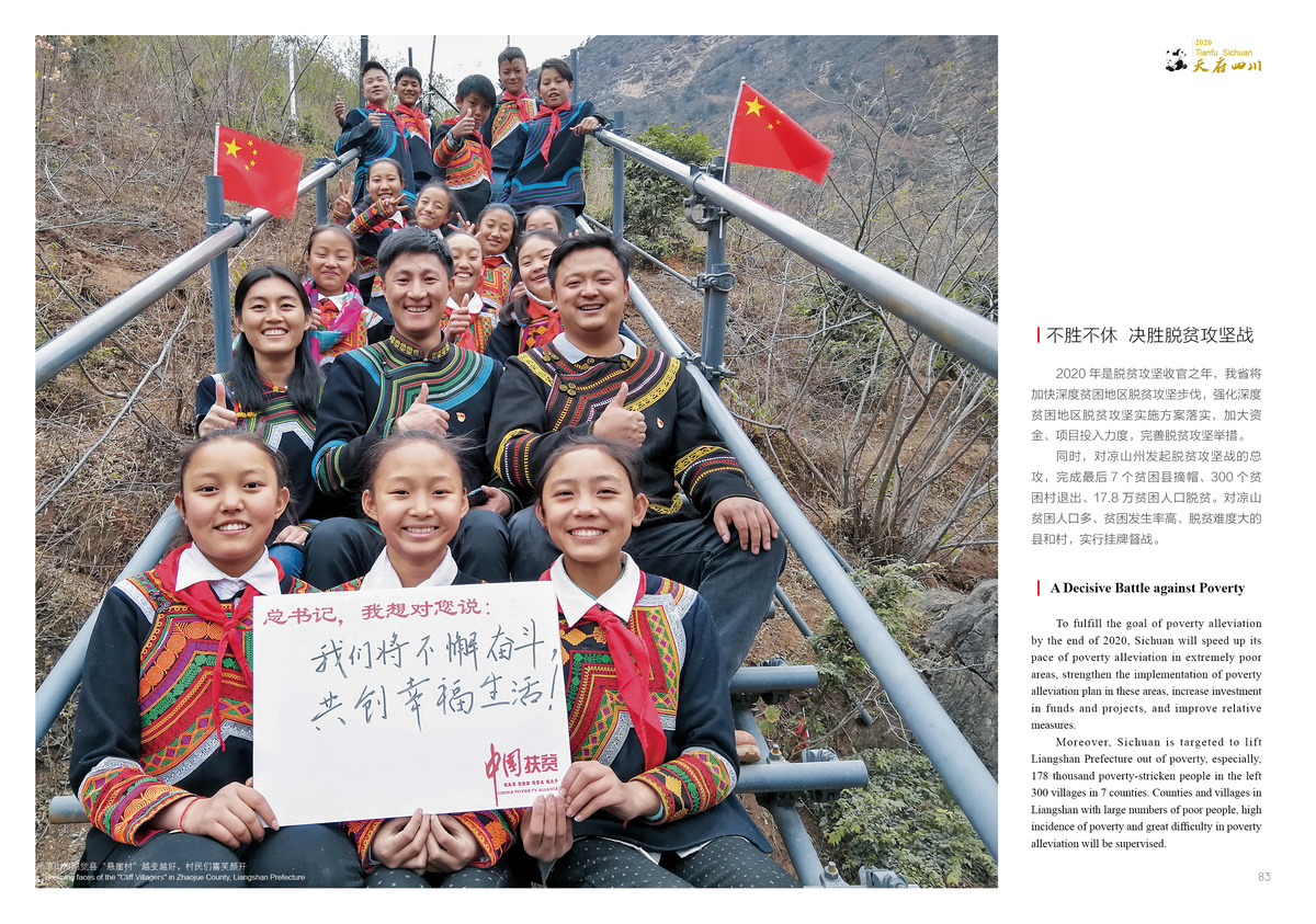 To fulfill the goal of poverty alleviation by the end of 2020, Sichuan will speed up its pace of poverty alleviation in extremely poor areas, strengthen the implementation of poverty alleviation plan in these areas, increase investment in funds and projects, and improve relative measures.