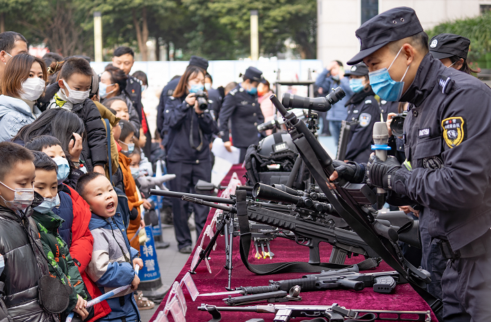活动现场还设置了特警、刑警、禁毒、交警等展示区,每个展示区都有讲解员进行详细介绍,让大家充分了解内江公安在健全完善“伞状+警务网格”治安防控体系,持续深化扫黑除恶,纵深推进禁毒人民战争,深化严打电信网络诈骗等突出违法犯罪方面所做的各项工作。