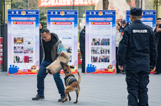 此次展示的科目有交警带来的精彩交通手势操,特警队员带来的酷炫队列队形、作战手语等实战技能,还有萌萌的警犬带来的警犬扑咬科目。