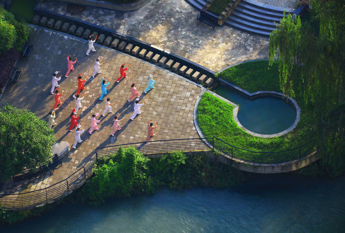 温江区市民在清晨的阳光下晨练(王军 摄)