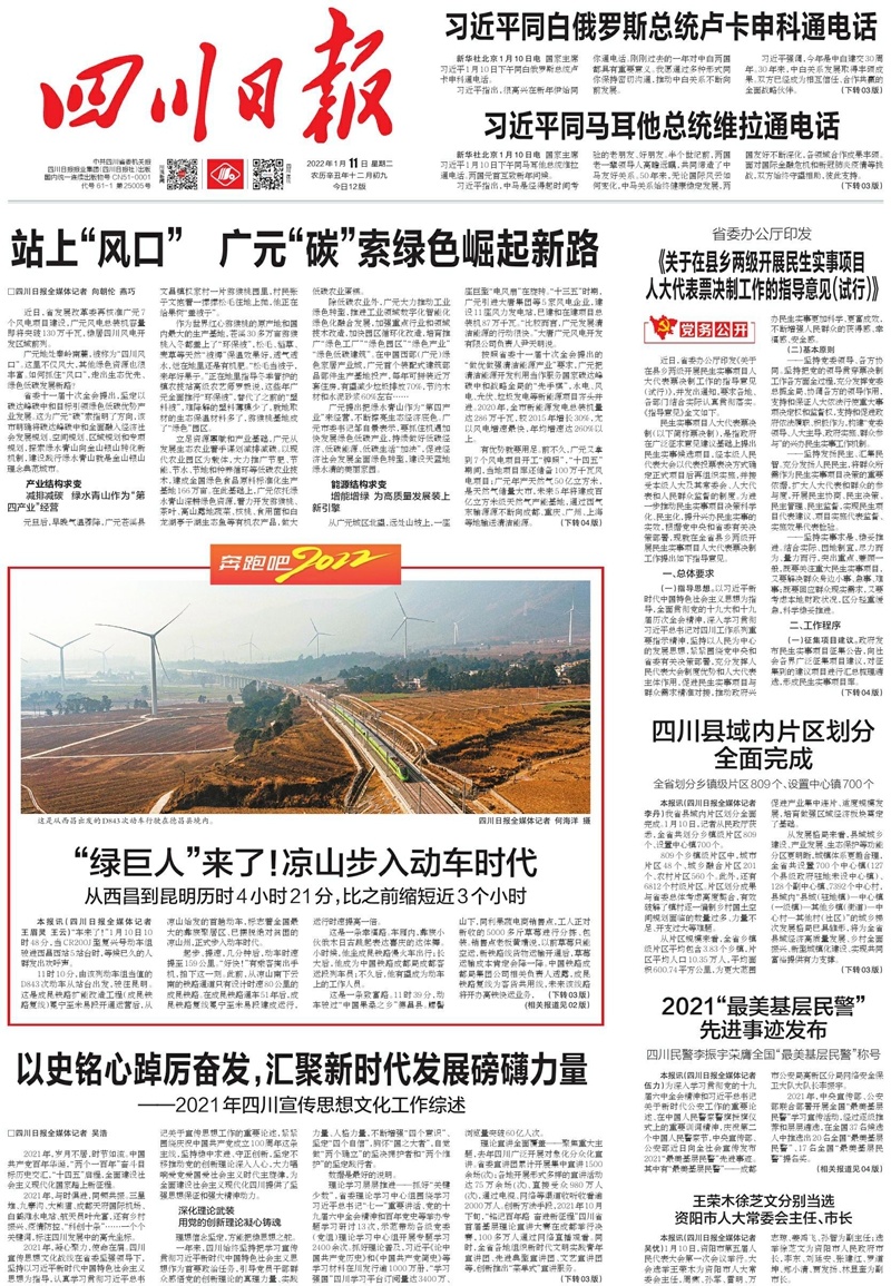 1月11日,四川日报头版头条刊发通讯《站上“风口” 广元“碳”索绿色崛起新路》,为广元加快建设践行绿水青山就是金山银山理念典范城市呐喊助威。