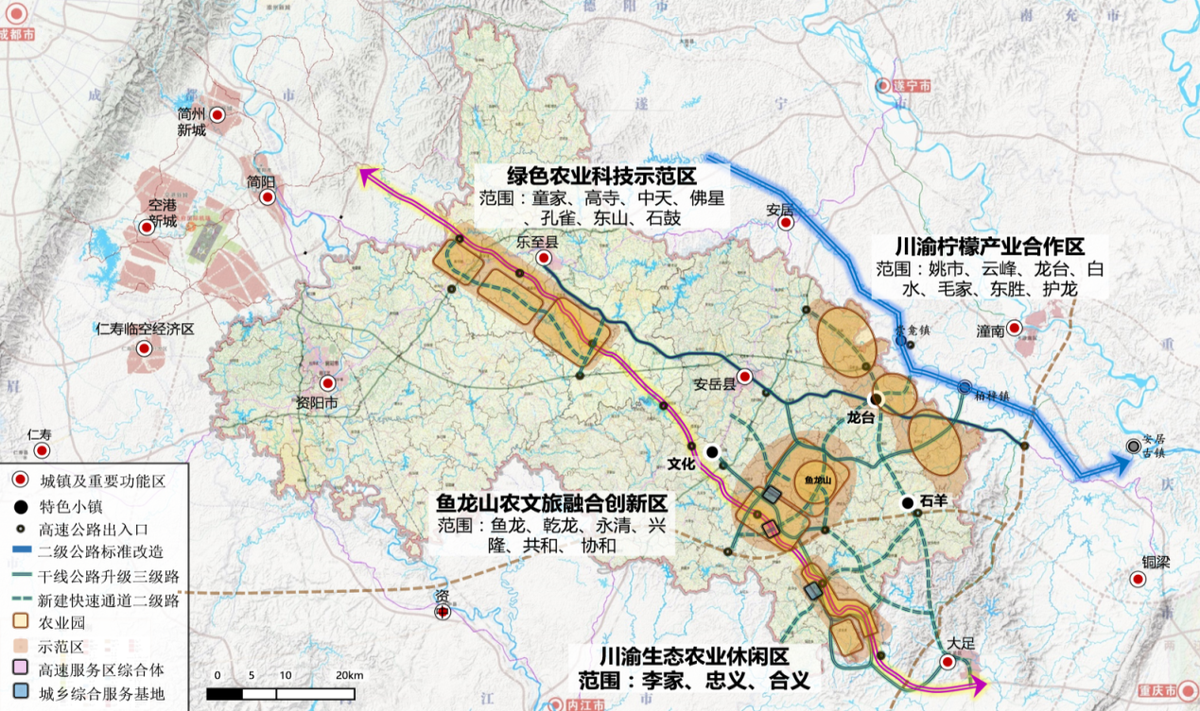 先行区的规划范围包括重庆市大足区、潼南区13个街镇,四川省资阳市乐至县、安岳县38个乡镇。在此区域内,《规划》提出,要在重庆市构建“一区两核,三带七园”的空间发展格局,四川省则重点建设“一路一河一山”三大片区。“一路”,即渝蓉高速农旅融合示范带;“一河”,即琼江流域宜居乡村示范片;“一山”,即鱼龙山农文旅创新发展区。在“一路一河一山”内,先行建设“三镇四区十园”,包括3个特色小镇、4个产业集中发展区、10个现代农业园区。