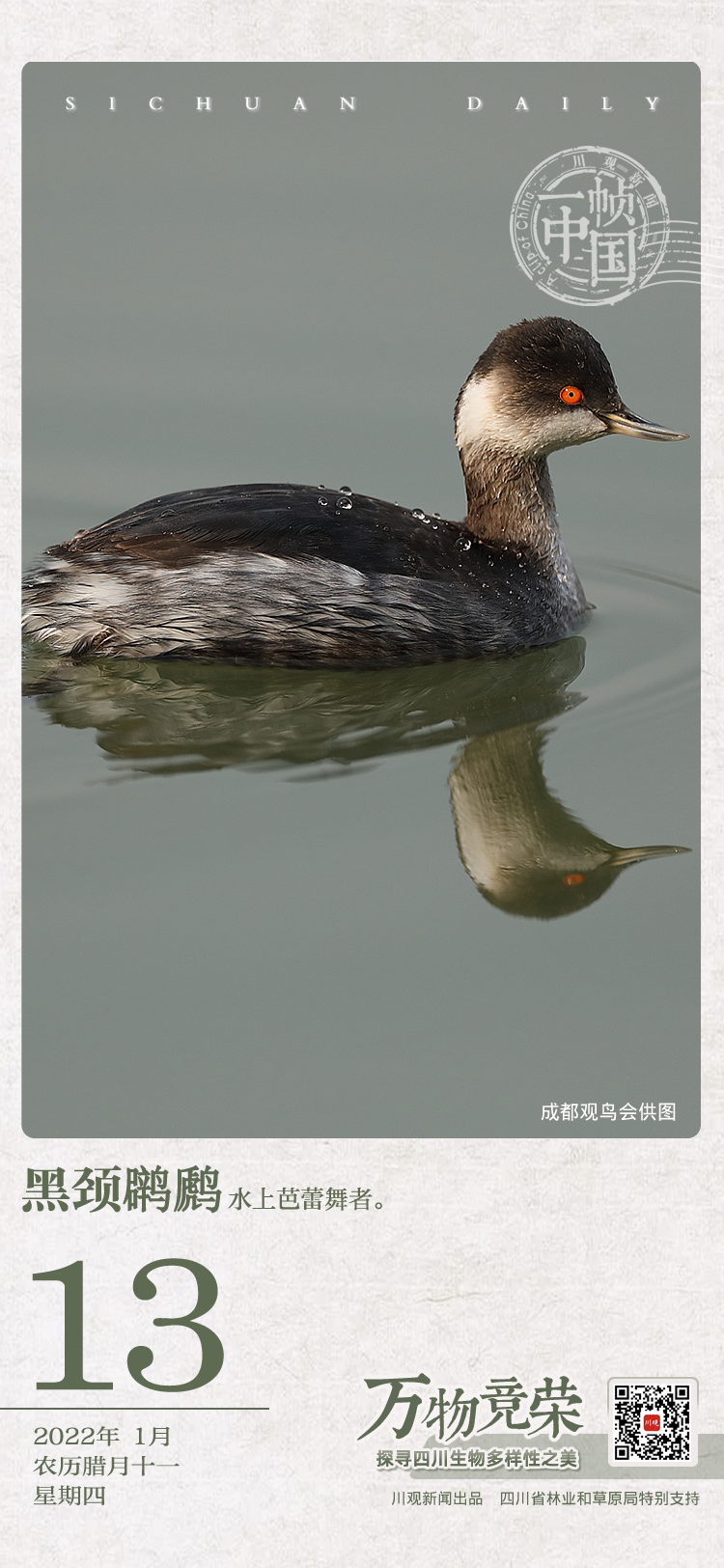 黑颈鸊鷉为一种中型水鸟,体长25-34厘米,体重不到0.5千克。嘴黑色,细而尖,微向上翘,眼红色,眼后有呈扇形散开的金黄色饰羽。主要通过潜水觅食,繁殖期为5-8月,营浮巢,每窝产卵4-6枚。分布于美洲地区和欧亚大陆及非洲北部,在我国主要繁殖于天山西部、内蒙古及中国东北,迁徙时会出现在我国多数地区,包括西南地区的河流湖泊。2021年被列入国家二级保护动物。