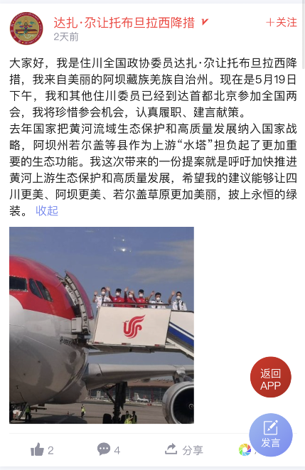 住川全国政协委员、阿坝州政协副主席达扎·尕让托布旦拉西降措来自美丽的阿坝州,他告诉网友,今年参会,他将呼吁加快推进黄河上游生态保护和高质量发展,建议加大生态补偿力度,健全流域生态补偿长效机制等。