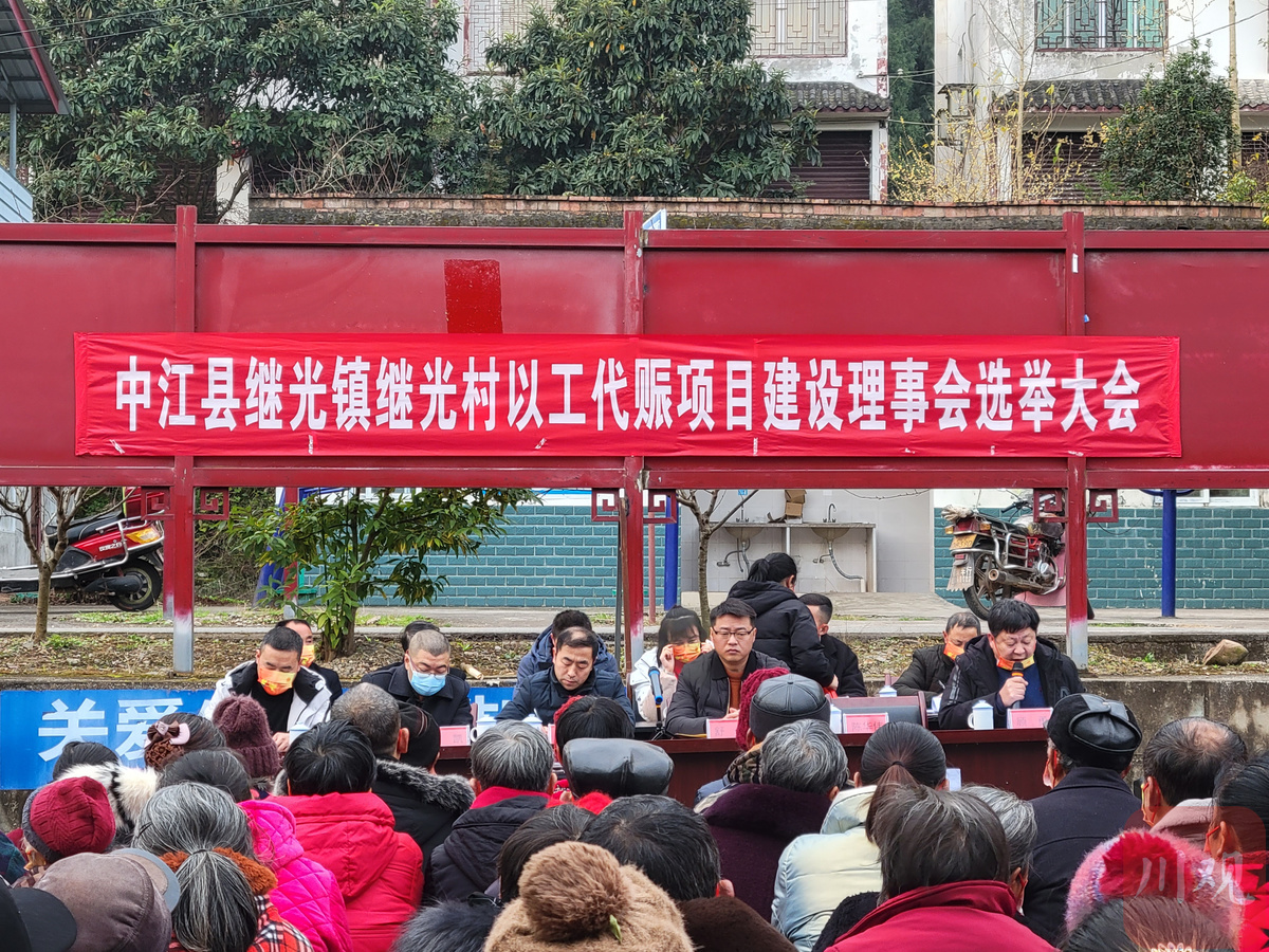 1月10日,中江县继光镇继光村村委会人头攒动,村民们搬上凳子,早早地等候在院坝里。当天,村里将举行以工代赈项目建设理事会选举大会。