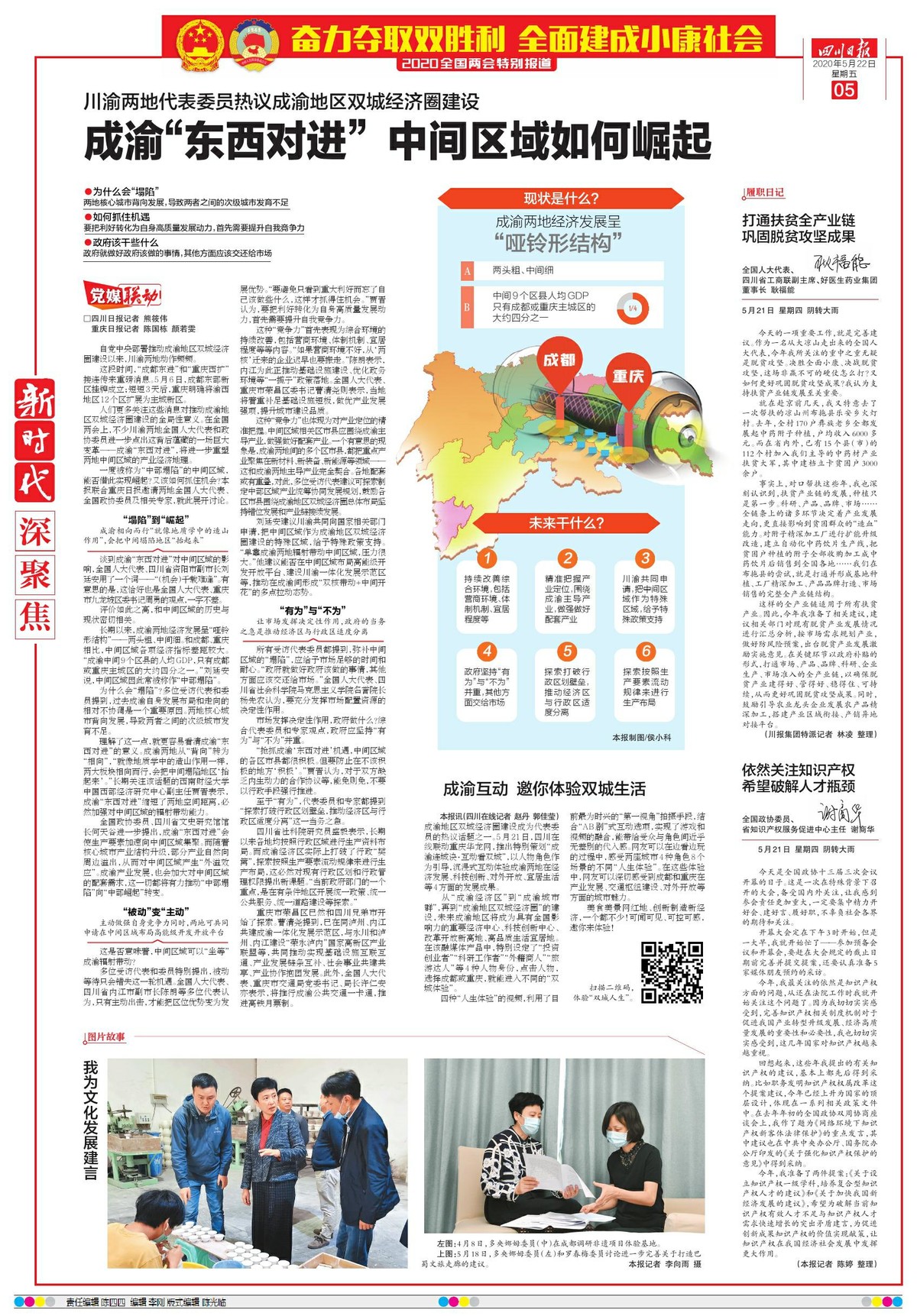 5月22日四川日报第5版“两会特别报道”版面,以大篇幅推出四川日报与重庆日报的联合报道《川渝两地代表委员热议成渝地区双城经济圈建设》。