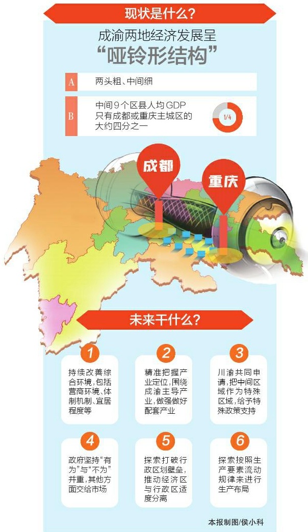 长期以来,成渝两地经济发展呈“哑铃形结构”——两头粗、中间细。和成都、重庆相比,中间区域各项经济指标差距较大。“成渝中间9个区县的人均GDP,只有成都或重庆主城区的大约四分之一。”刘廷安说,中间区域因此常被称作“中部塌陷”。