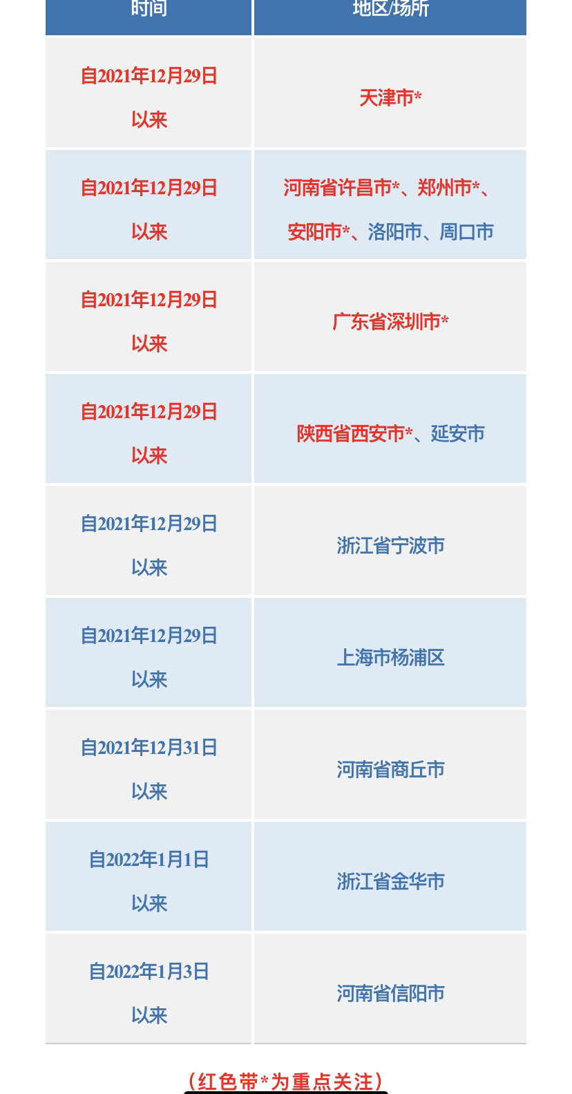 1随时关注国内新冠肺炎疫情变化情况,近期重点关注天津市,河南省安阳市、许昌市、郑州市,陕西省西安市,广东省深圳市疫情,不前往高、中风险地区以及发生本土疫情的地区。如您近期有疫情地区旅居史,收到提醒短信或健康码变为“黄码”,请立即向所在社区(村)、单位或入住酒店报备旅居史,按要求做好核酸检测,配合做好隔离管控措施。