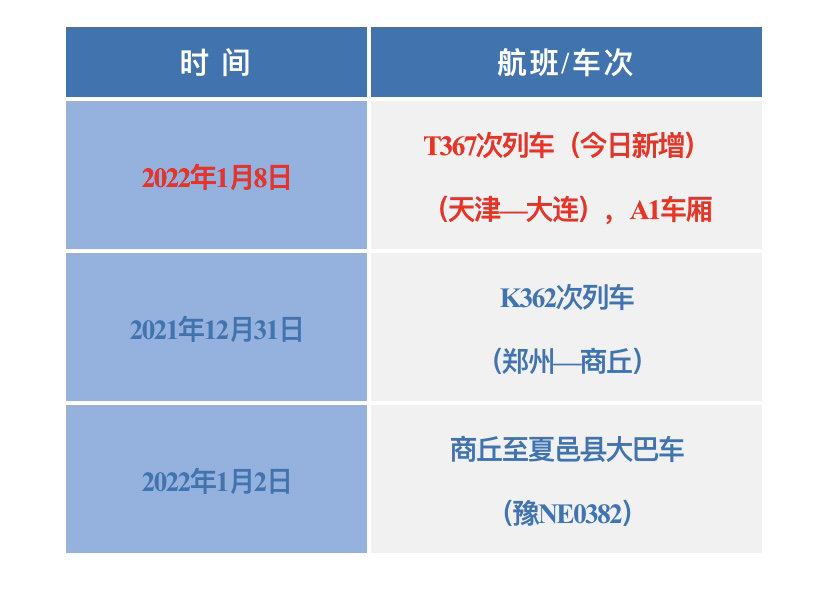 搭乘过以下交通工具的来(返)川人员,第一时间主动向社区(村)、单位或入住酒店报备旅居史,配合做好各项疫情防控工作。