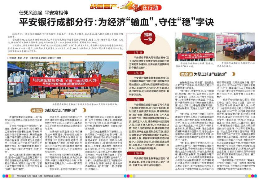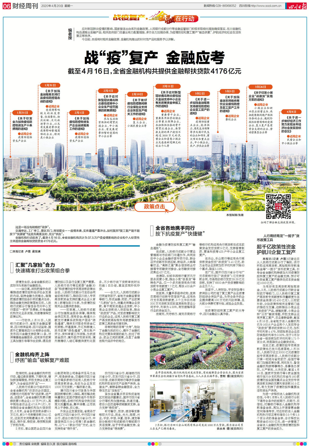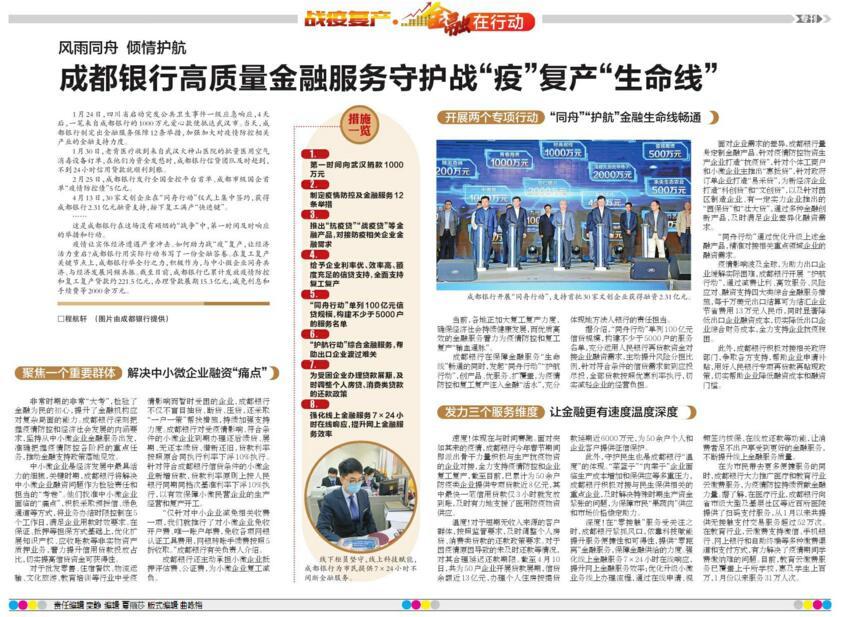 为应对新冠肺炎疫情的影响,国家接连出台系列金融政策,人民银行成都分行等金融监管部门积极采取细化措施确保落实,在川金融机构迅速推出金融产品,相关政府部门也拿出有力配套措施,多方合力加强协调,为疫情防控和复工复产“输血供氧”,护航经济和社会生活恢复正常秩序。
