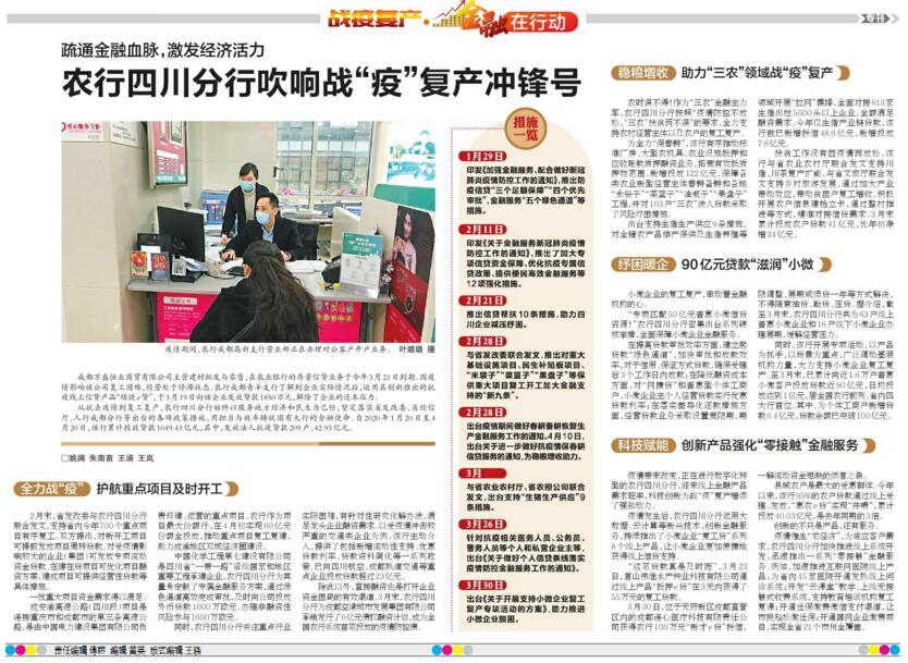 疏通金融血脉,激发经济活力。从抗击疫情到复工复产,农行四川分行始终以服务地方经济和民生为己任,坚定落实省发改委、省经信厅、人行成都分行等出台的各项政策措施,用担当与效率铸就国有大行的金融使命。
