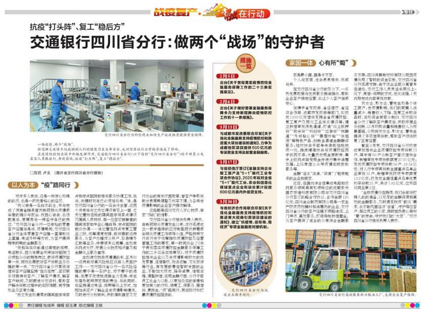 在疫情防控阻击战中积极发挥作用,交通银行四川省分行的干部员工及其家人勇敢逆行,奔赴前线:抗疫“打头阵”,复工“稳后方”。