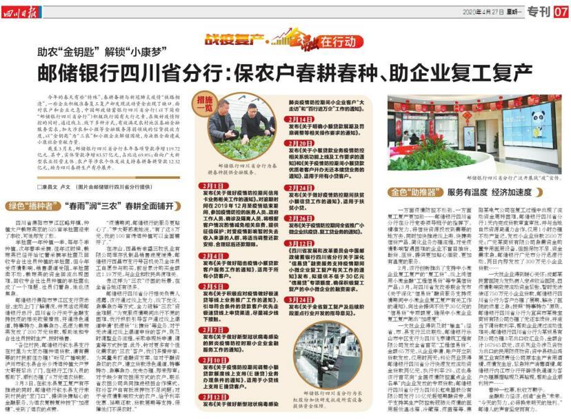 助农“金钥匙”,解锁“小康梦”。面对农户和企业之急,中国邮政储蓄银行四川省分行积极践行国有大行之责,在做好疫情防控的同时,通过线上、线下多种方式,有效满足农村地区基础金融服务需求,加大涉农和小微等金融服务薄弱领域的信贷投放力度,以“金钥匙”为“三农”和小微企业解锁困境,为决胜全面建成小康社会贡献力量。