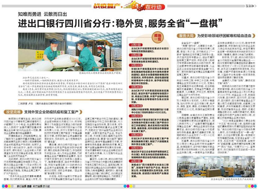 知难而勇进,云散而日出。面对疫情防控和经济社会发展的双重考验,中国进出口银行四川省分行进一步发挥政策性金融逆周期调节作用,攻坚克难,服务大局,书写自己的答卷。